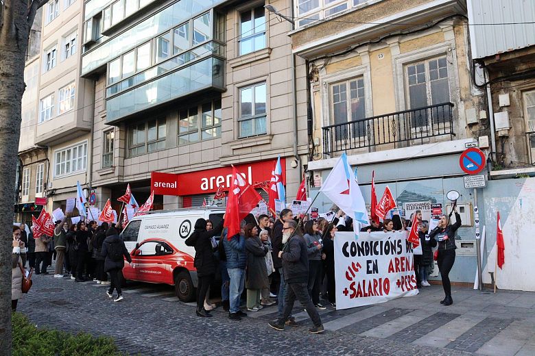 As traballadoras e traballadores das tendas Arenal da provincia da Coruña están este venres en folga para demandar uns salarios dignos e un reforzo do persoal. Denuncian que máis do 70% do persoal (a maioría mulleres) cobra o SMI, malia os avultados beneficios da empresa. Por iso hoxe, coincidindo co Black Friday, acordaron saír á rúa para reclamar cobrar "como as compañeiras que están reguladas polo convenio do comercio vario".