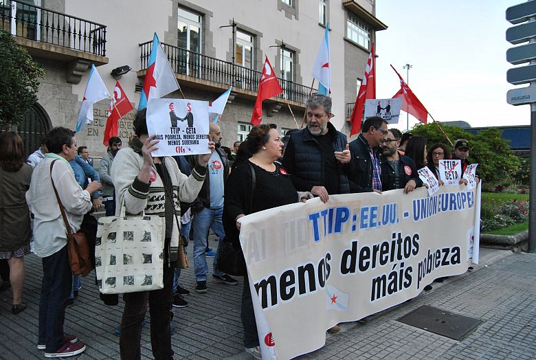 "Nin as reticencias de Valonia nin as manifestacións realizadas no seu día por día por dirixentes de estados da UE dando por rotas as negociacións do TTIP (o outro gran acordo que se negocia cos EEUU), supoñen a liquidación definitiva dos tratados. Pois as grandes compañías transnacionais van presionar para conseguir que definitivamente se asinen estes perversos acordos, tan favorábeis ao seus intereses", advertiu o Secretario Comarcal da Coruña, Xabier Filgueira, durante a protesta realizada esta tarde diante da Delegación do Goberno. "Por iso, a CIG seguirá mobilizándose para esixir a non ratificación e a súa retirada definitiva".