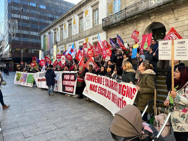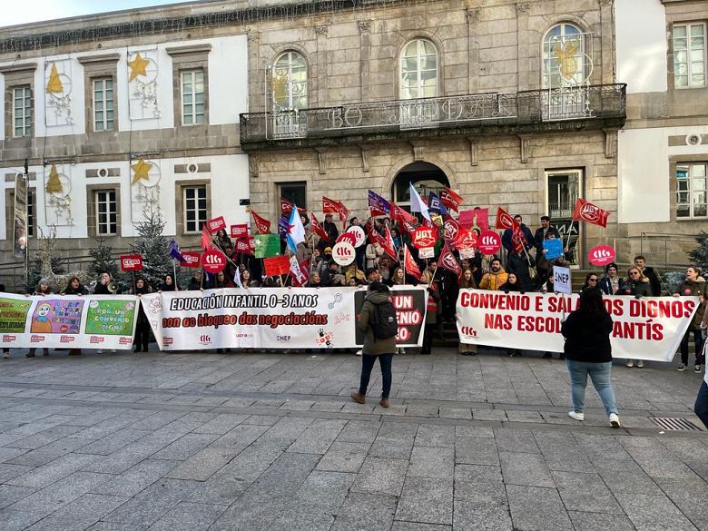 As traballadoras das escolas infantís privadas e de xestión indirecta, etapa 0-3, volveron este martes á folga para reclamar un convenio colectivo digno. Esta é a sexta xornada de folga que secundan e fano un día despois da última reunión da comisión negociadora, na que a patronal non levou ningunha proposta concreta emprazando as organizacións sindicais a outra xuntanza para o 15 de xaneiro, despois de levar xa dous anos de negociacións.