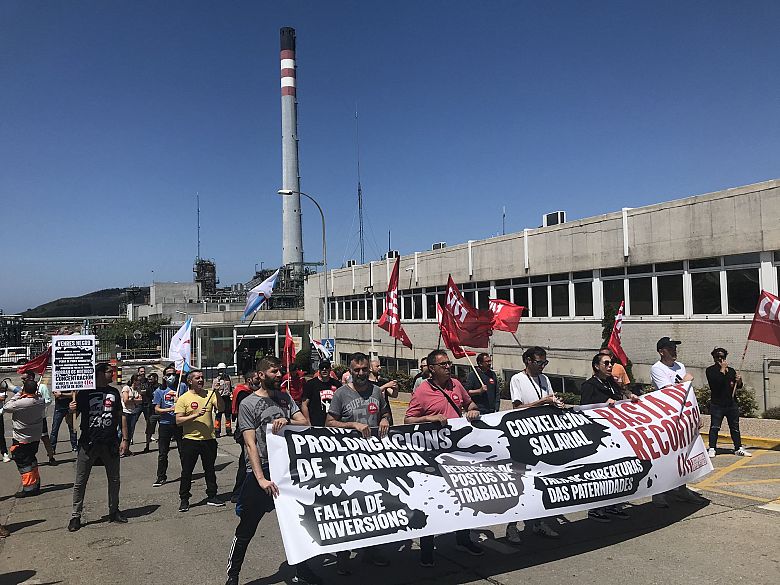 Ao berro de "menos prolongación máis contratación", "Josu Jon queremos inversións", ou "beneficios millonarios a conta dos salarios" traballadores e traballadoras da refinería da Coruña mobilizáronse este venres diante das instalacións para denunciar o deterioro das condicións laborais, especialmente polo exceso de xornada, as dificultades para exercer os dereitos de conciliación ou a falta de investimentos no complexo industrial por parte de Repsol.