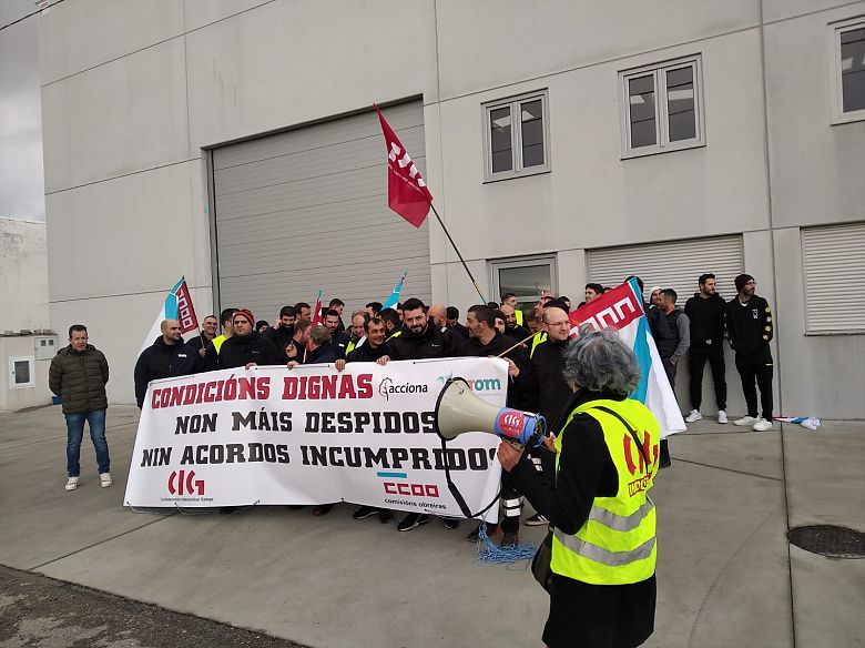 Traballadores e traballadoras de EROM SLU Lugo (división de Acciona que realiza o mantemento dos parques eólicos) concentráronse este xoves diante da nave que a empresa ten en Vilalba para esixir o cumprimento dos acordos acadados, que se respecten os dereitos laborais e salariais e que se traslade á representación social toda a documentación solicitada.