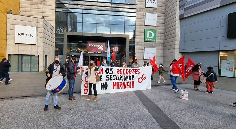 Traballadores e traballadoras da seguridade privada do Centro Comercial Marineda City concentráronse o pasado sábado para denunciar os recortes que a dirección do complexo comercial leva anos aplicando no servizo de vixilancia. Na concentración, convocada pola CIG e CCOO, advertiuse que os recortes non só afectan ao persoal de seguridade, senón tamén ao persoal auxiliar, nun intento de maximizar beneficios a conta de destruír emprego e sobrecargar de traballo.