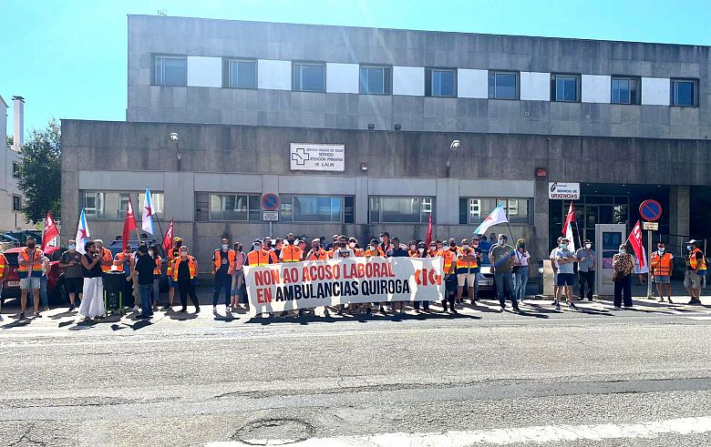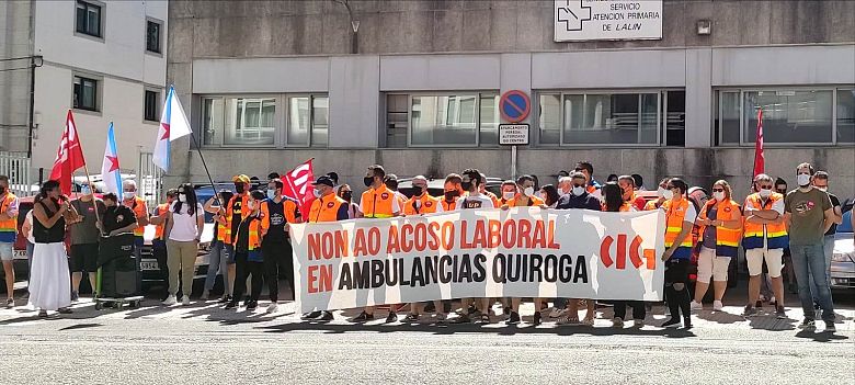 Traballadores e traballadoras do sector de ambulancias concentráronse este venres diante do Centro de Saúde de Lalín para apoiar os seus compañeiros e compañeiras da base do 061 nesta vila e para denunciar as presións constantes e os incumprimentos desde que Ambulancias Quiroga se fixo cargo da concesión no lote da área sanitaria de Santiago. A mobilización, convocada pola CIG, é a primeira que se produce tras varios intentos de reunirse co empresario para buscar unha solución, ao que este se ten negado.