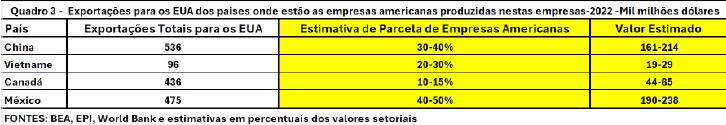 Como revela o quadro 3 uma parcela importante do défice da balança comercial dos EUA com estes 4 países resulta da produção de empresas americanas que se deslocalizaram para esses países e que depois exportam uma parte da sua produção para os EUA, criando uma concorrência desleal com as que não se deslocalizaram levando milhares delas à falência, e apoderando-se desta forma da maior parte do mercado dos EUA e arrecadando lucros gigantescos. O mesmo sucede em relação ao mercado europeu para onde também vendem.