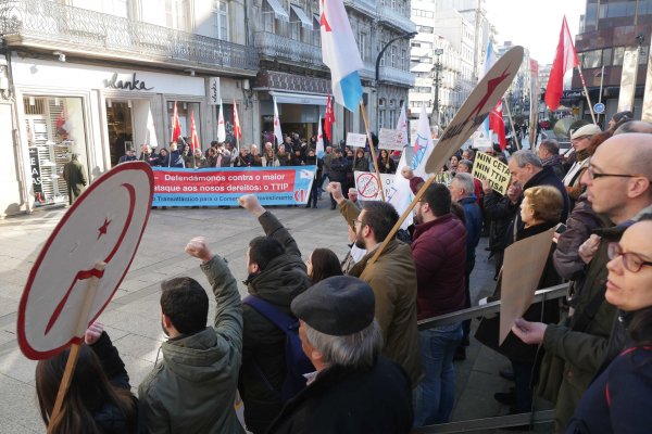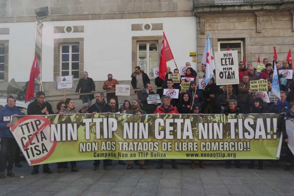 Arredor de 200 persoas participaron hoxe en Vigo na concentración convocada pola plataforma 'Non ao TTIP Galiza' -que agrupa máis de medio cento de organizacións sindicais, políticas e sociais- para rexeitar os tratados de libre comercio, aínda que nesta ocasión a protesta centrouse no CETA que van aprobar nos vindeiros días a Unión Europea e o Canadá.