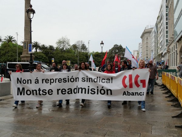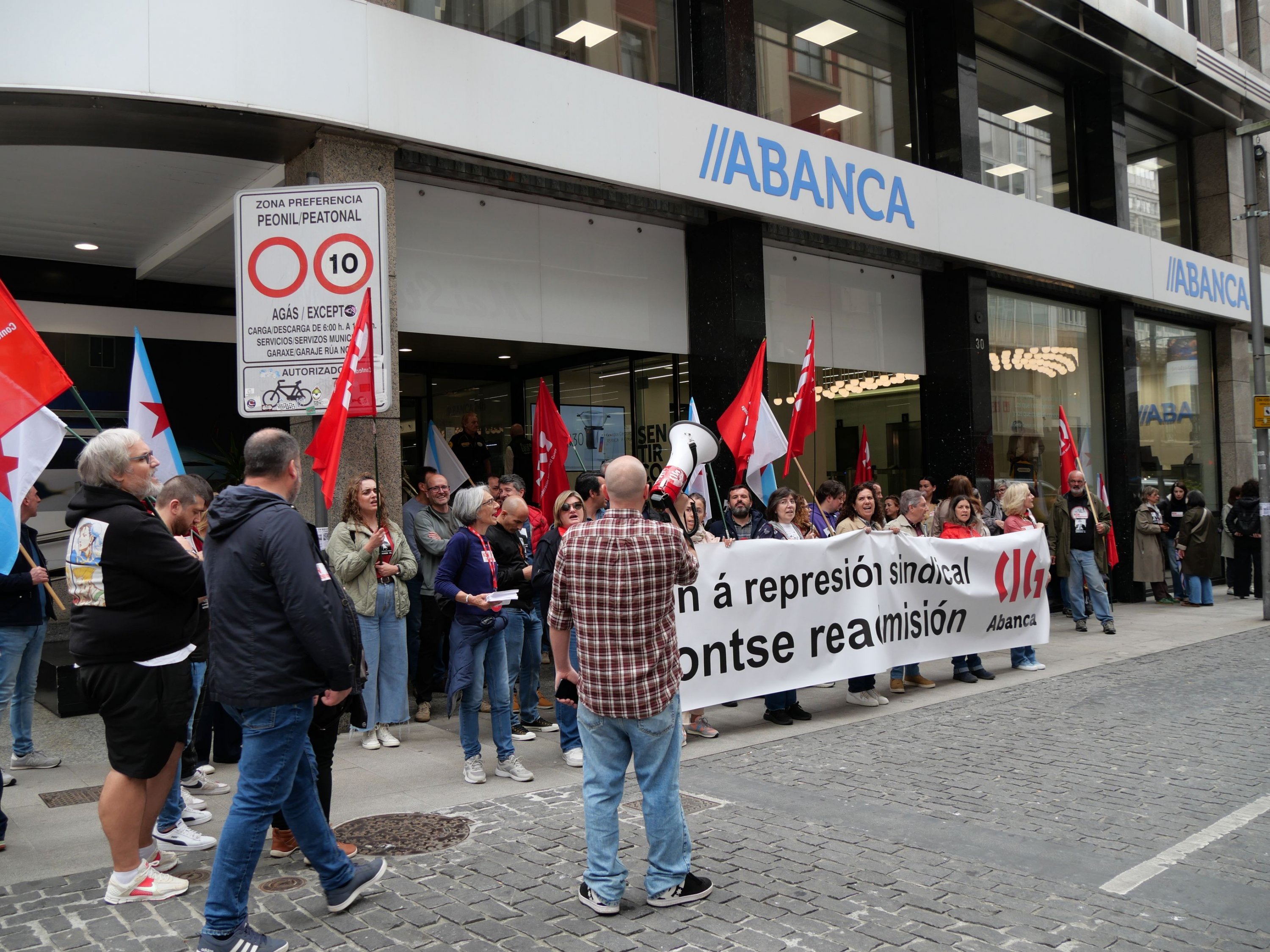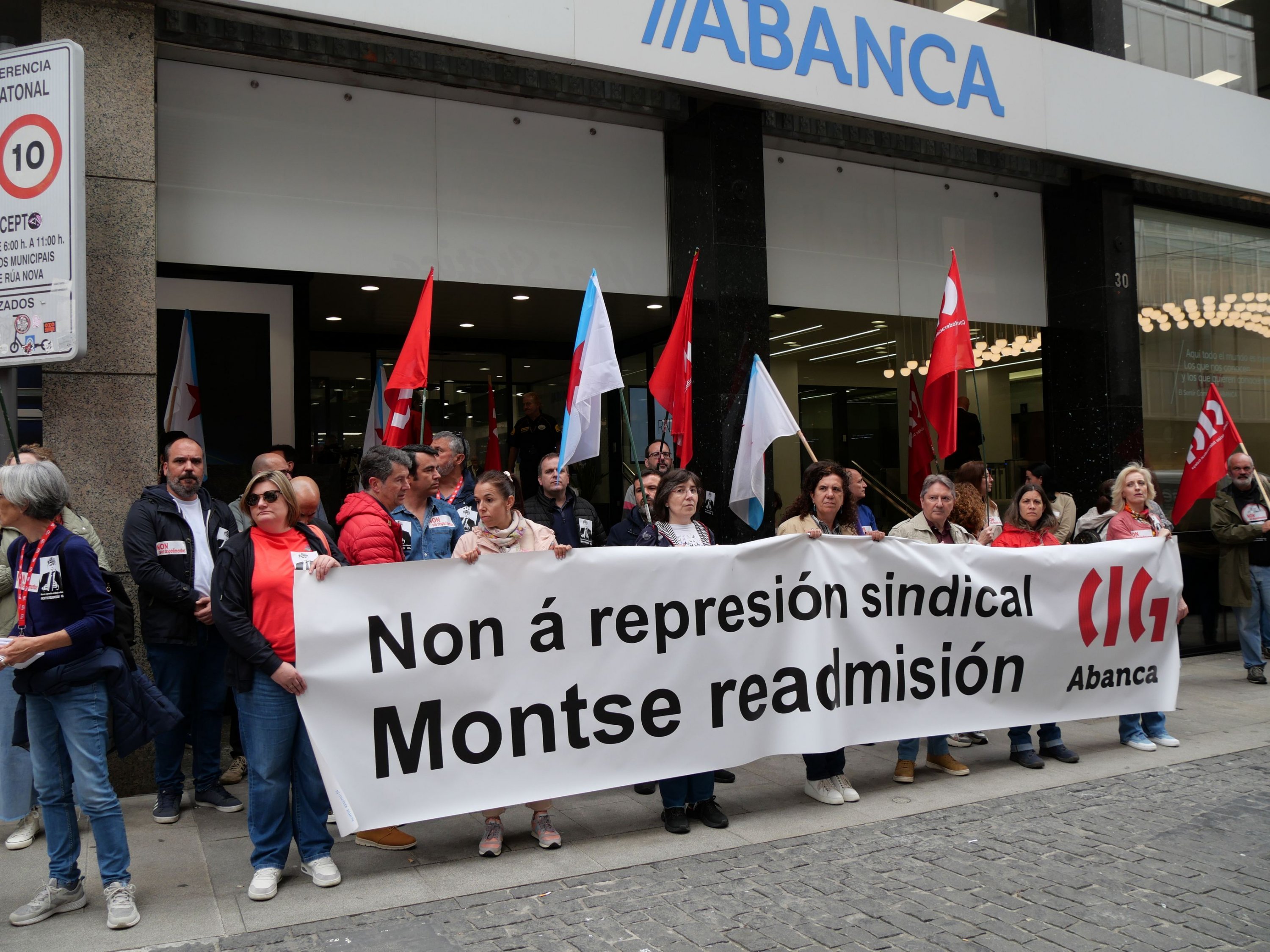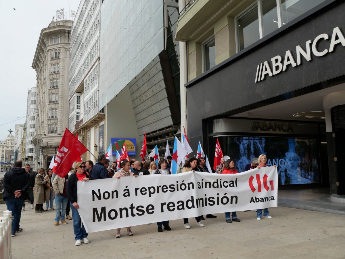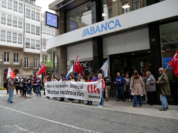 A xeira de mobilizacións concluíu diante da OP de Abanca para denunciar, unha vez máis, a represión sindical e reclamar a readmisión da compañeira Montse, delegada da CIG no comité provincial de Pontevedra, que foi vítima dun despedimento represivo por parte da empresa en xullo de 2025. O xuízo polo despedimento foi adiado até o mes de setembro.
