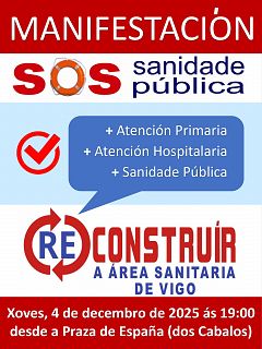 SOS Sanidade Pública convoca unha manifestación para instar o Sergas a “reconstruír” a área sanitaria de Vigo