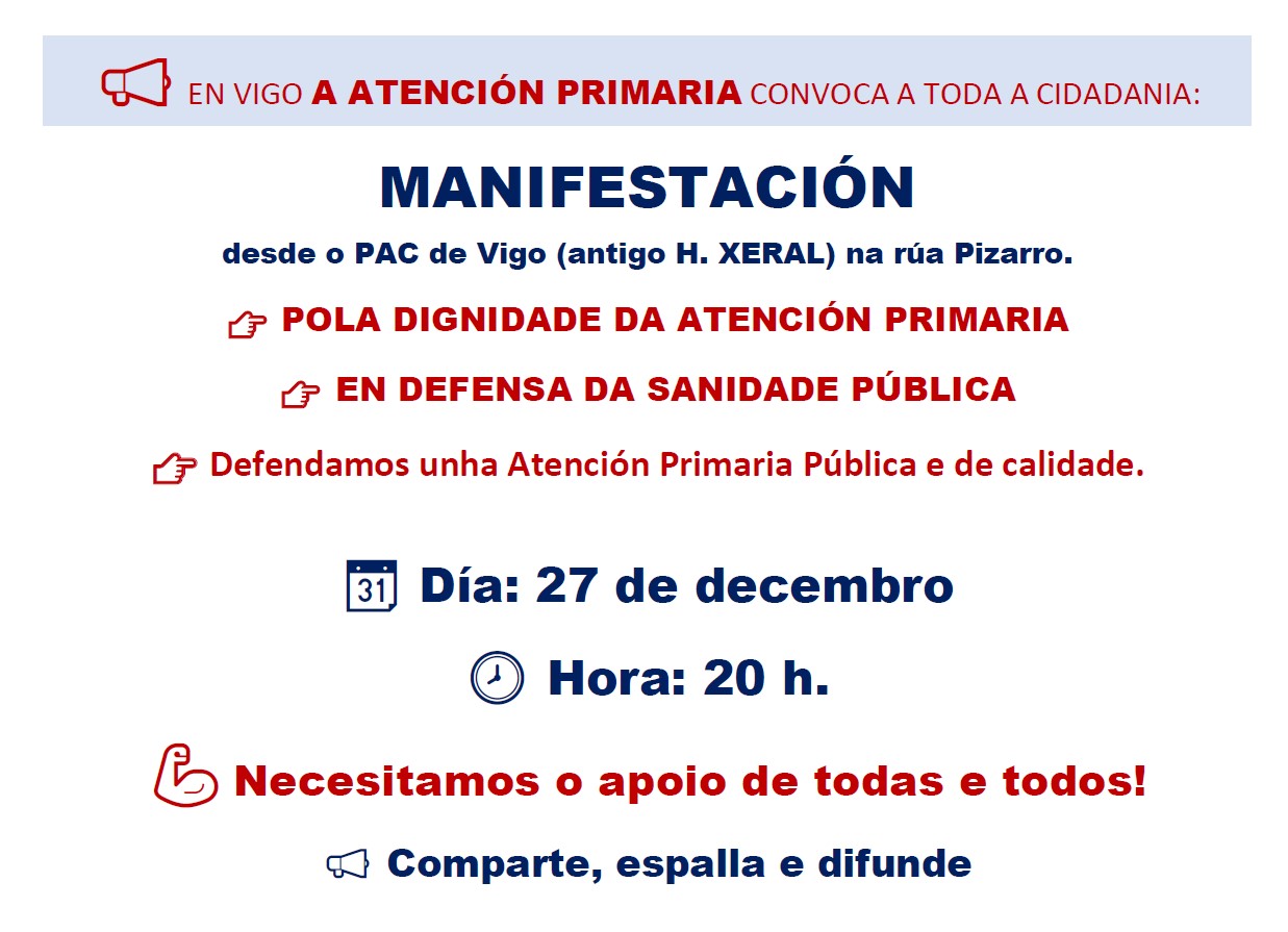 CIG-Saúde de Vigo chama a participar na manifestación "pola dignidade na Atención Primaria" deste xoves