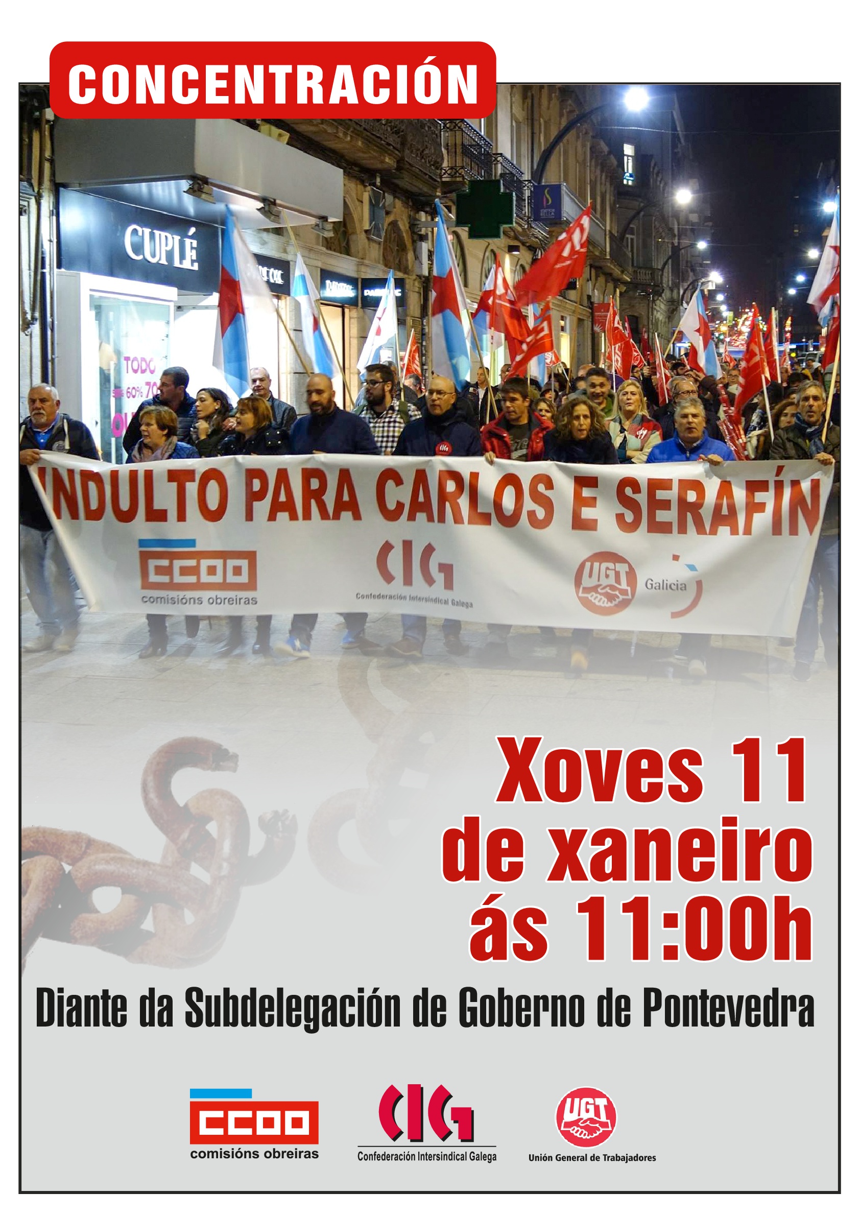 As centrais mobilizaranse na Subdelegación do Goberno en Pontevedra para reclamar o indulto a Carlos e Serafín