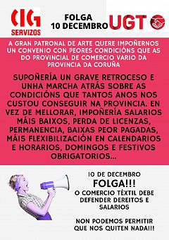 Folga no gran comercio téxtil da provincia da Coruña o 10 de decembro contra a imposición do convenio estatal impulsado pola patronal ARTE