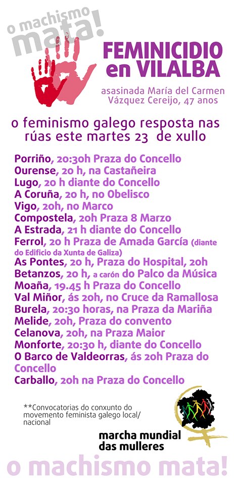 O feminismo galego convoca concentracións o martes 23 de xullo en repulsa á violencia machista