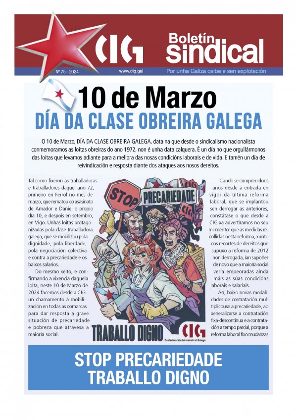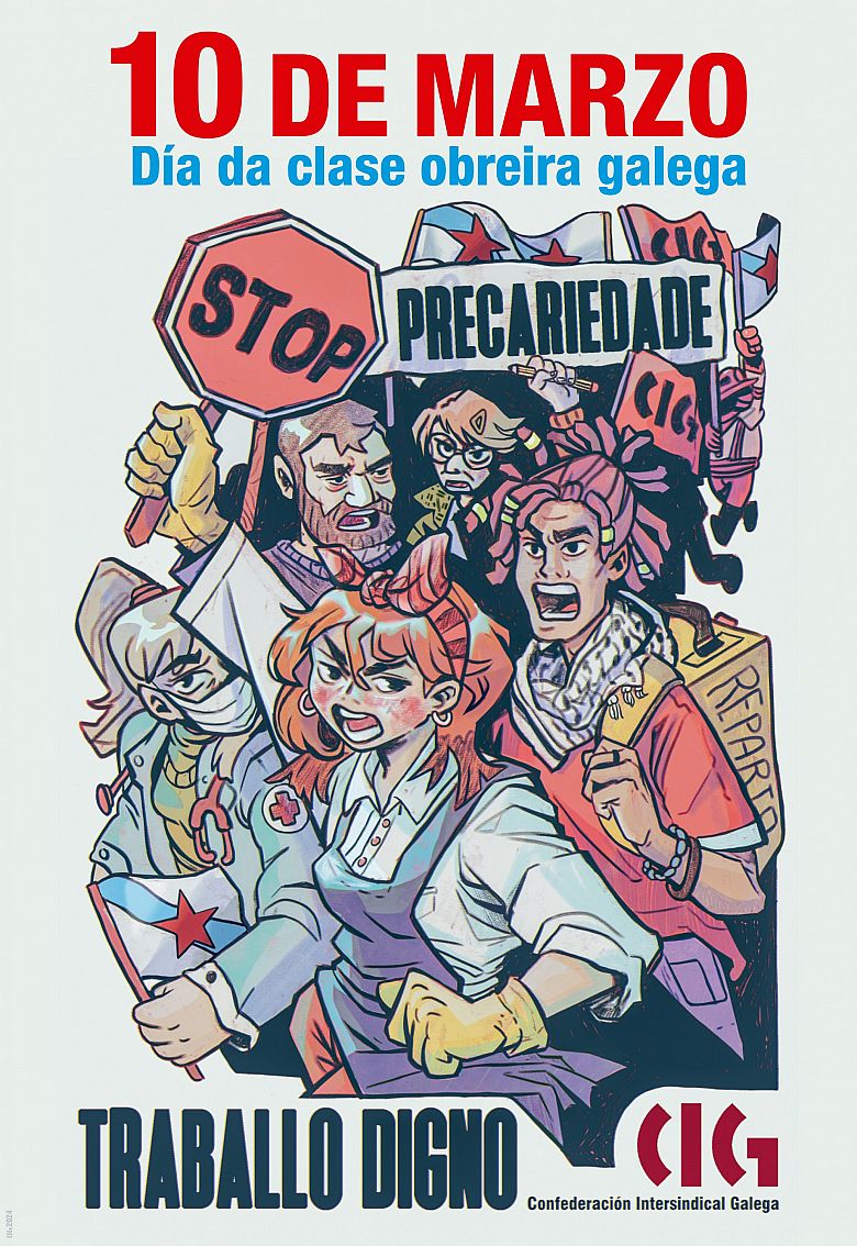 Neste 10 de Marzo de, Día da Clase Obreira Galega, a CIG fai un chamamento á mobilización nas sete comarcas para dar resposta á grave situación de precariedade e pobreza que atravesa a maioría social e reclamar un marco galego de relacións laborais. Reivindicando a vixencia das loitas de 1972, o acto central terá lugar en Ferrol coa tradicional ofrenda floral ao monumento ao 10 de Marzo e a posterior manifestación até o Cantón. A CIG tamén ten convocadas manifestacións en Vigo e Compostela e concentracións na Coruña, Pontevedra, Lugo e Ourense.