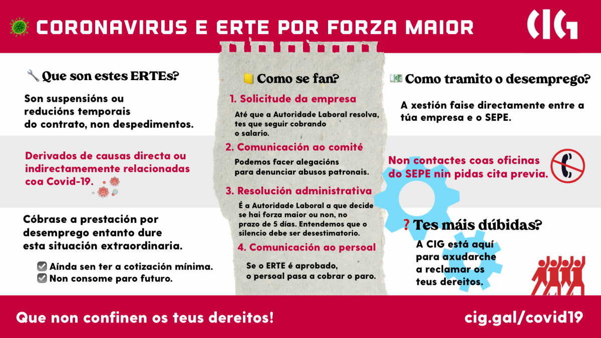 A CIG Lugo–A Mariña denuncia que lle están a chegar información por parte de traballadores e traballadoras sobre esti tipo de prácticas en varias empresas da provincia. Dita actuación, advirten, constitúe un fraude á Seguridade Social e ao SEPE e ademais representa "unha actitude absolutamente miserábel, preocupándose exclusivamente dos seus intereses, cargando sobre as traballadores e traballadoras e sobre as arcas do Estado as obrigas que como empregadores teñen". A CIG considera estes feitos de extrema gravidade e dunha absoluta falta de sensibilidade economica e social.