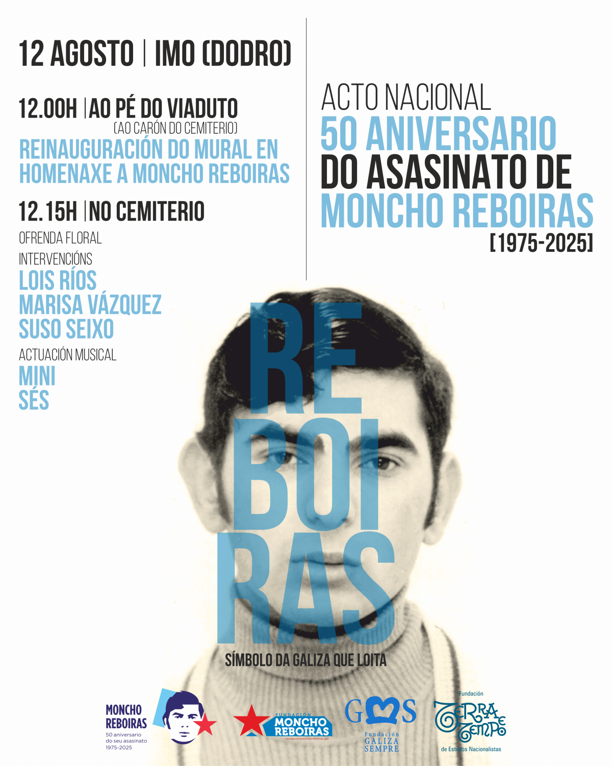 A CIG chama a participar no acto nacional conmemorativo do 50 aniversario do asasinato de Moncho Reboiras, que terá lugar o 12 de agosto en Imo (Dodro). As actividades están promovida por diferentes entidades galegas, entre elas a Fundación Moncho Reboiras constituída pola CIG.