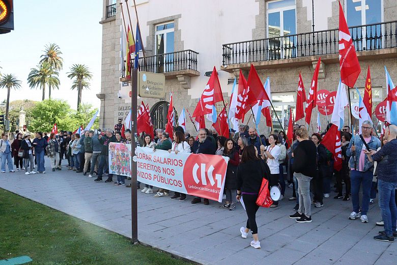 Representantes sindicais das tres federacións da Área Pública da CIG (Ensino, Administración e Saúde) concentráronse este xoves na Coruña diante da Delegación do Goberno para exixir a inmediata negociación dunha suba salarial que recupere o poder adquisitivo que se perdeu, como mínimo, desde o pacto sindical de CCOO e UGT de 2022, e no que se salvagarde que as retribucións nunca estarán por debaixo da evolución dos prezos.