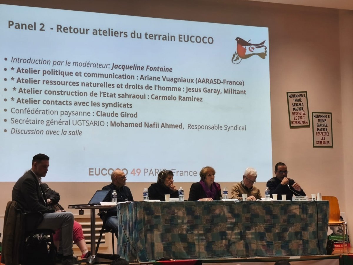 Após o acto de apertura coas intervencións do secretario xeral da central saharauí, Nafi Ahmed, e do secretario xeral da OUSA (Organización da Unidade Sindical Africana), Arezki Mahzoud, diferentes poñentes abordaron aspectos como a perspectiva do dereito internacional sobre a Resolución 2797 do 31 de outubro de 2025 do Consello de Seguridade da ONU e dos dereitos humanos no Sáhara Occidental; a explotación de recursos dos territorios ocupados e a complicidade internacional; a situación das persoas prisioneiras saharauís en cárceres marroquís ou as experiencias sindicais tanto nos campamentos de persoas refuxiadas como nos territorios ocupados a través do dereito do traballo.