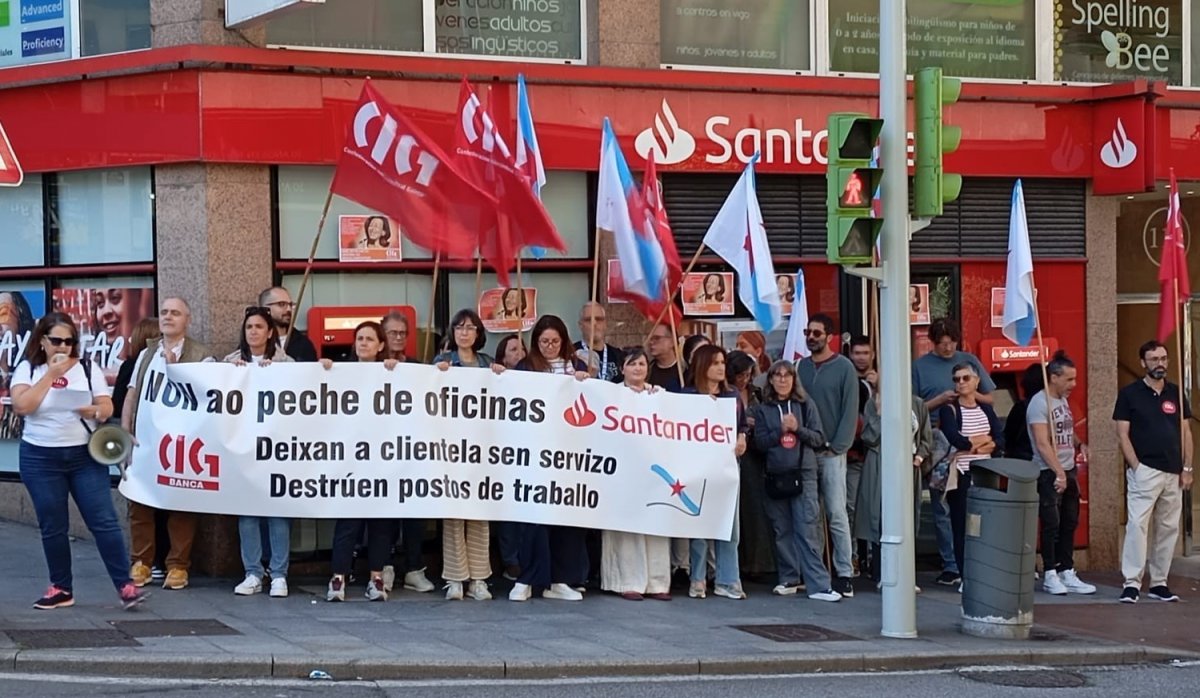 A CIG iniciou hoxe en Vigo un un calendario de mobilizacións para rexeitar o modelo de negocio que está a implantar o Banco Santander apoiándose na dixitalización forzosa da clientela e nunha nova tipoloxía de oficinas, que ten como consecuencia o peche de sucursais e a destrución de emprego. No que vai de ano a entidade xa clausurou 17 oficinas en Galiza e un total de 160 no conxunto do Estado e amortizou numerosos postos de traballo. As protestas continuarán en Lugo este venres 3 de outubro e na Coruña o vindeiro día 13.