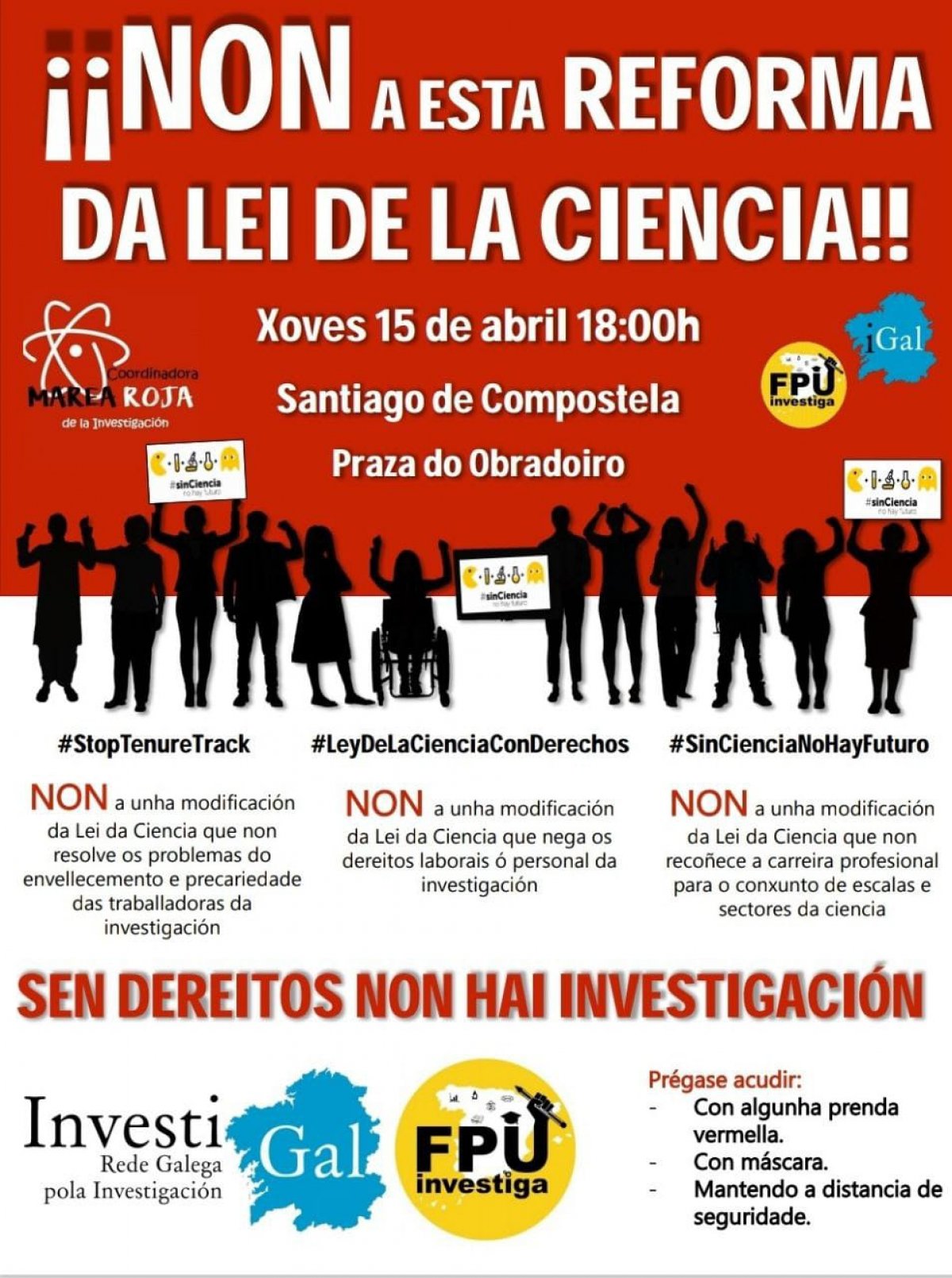 A CIG-Saúde chama a apoiar ao persoal investigador este xoves día 15 de abril, sumándose á concentración que teñen convocada ás 18:00 horas na Praza do Obradoiro, en Santiago de Compostela, baixo o lema “Non a esta Reforma da Lei da Ciencia!” Pregan que se acuda con algunha prenda vermella e que se respecten todas as medidas de seguridade: máscara e distanciamento social.