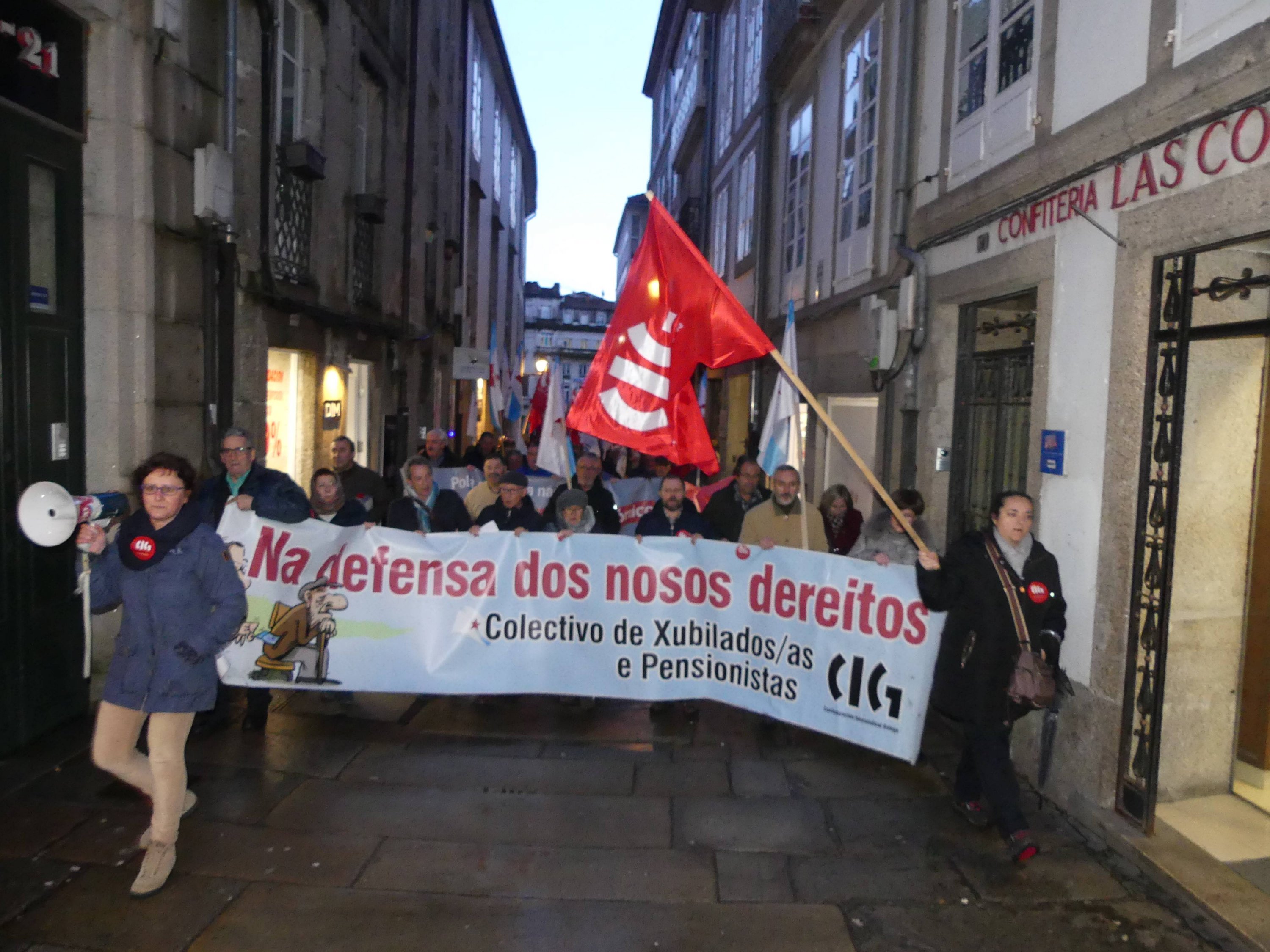 Miles de persoas mobilizáronse este xoves en cidades e vilas galegas como A Coruña, Cee, Boiro, Santiago, Ferrol, As Pontes, Pontevedra, Lalín, Vigo, Lugo Ourense ou Burela convocadas polo Colectivo de Xubilados/as e Pensionistas da CIG, que chamou a non deixarse enganar polas “mentiras” que, en forma de informacións, análises, estudos e declaracións públicas, poñen en cuestión a viabilidade do sistema público de pensións para “xustificar así o seu desmantelamento e introducir os plans privados que benefician e enriquecen só ás grandes empresas e fondos financeiros que os xestionan”.