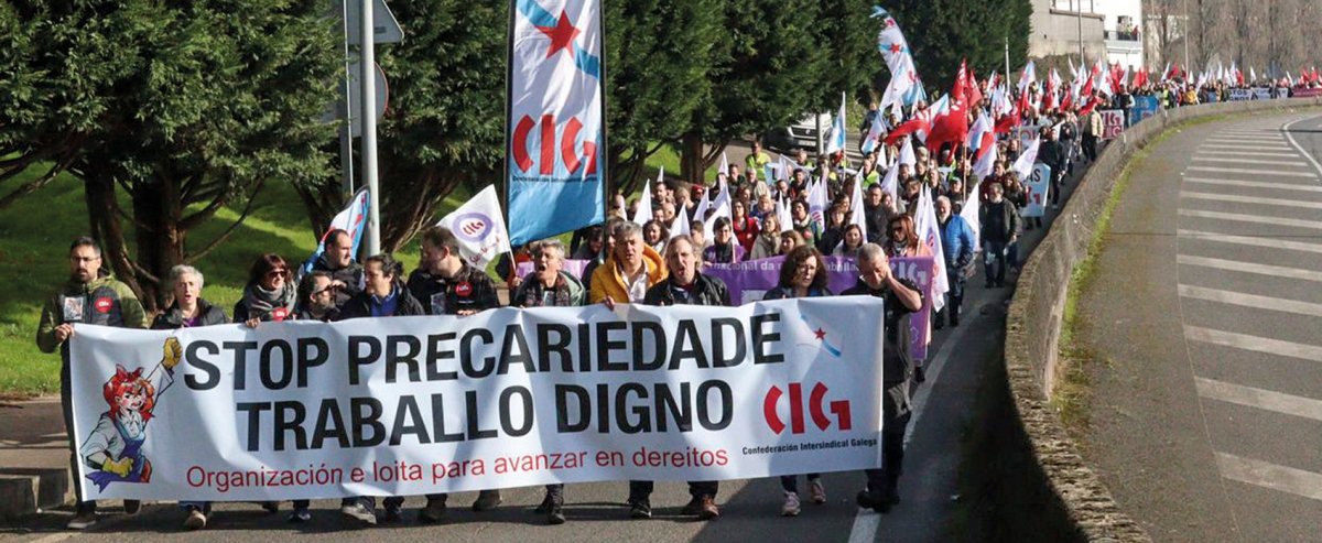Co inicio do mes de febreiro, a CIG arrincou a campaña “Stop Precariedade! Traballo digno” cunha multitudinaria asemblea e unha manifestación en Compostela na que máis de 2.000 delegados e delegadas reclamaron unha nova lexislación para dignificar as condicións laborais da clase traballadora galega. A precariedade chegou a tal punto que hoxe ter un traballo non garante os ingresos necesarios para poder vivir dignamente.