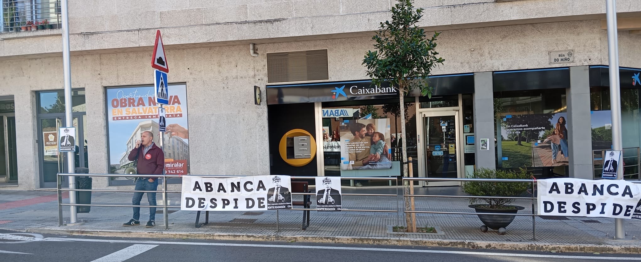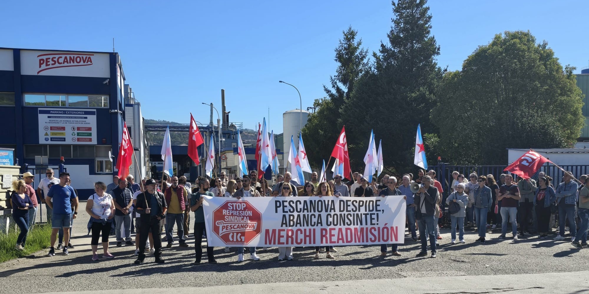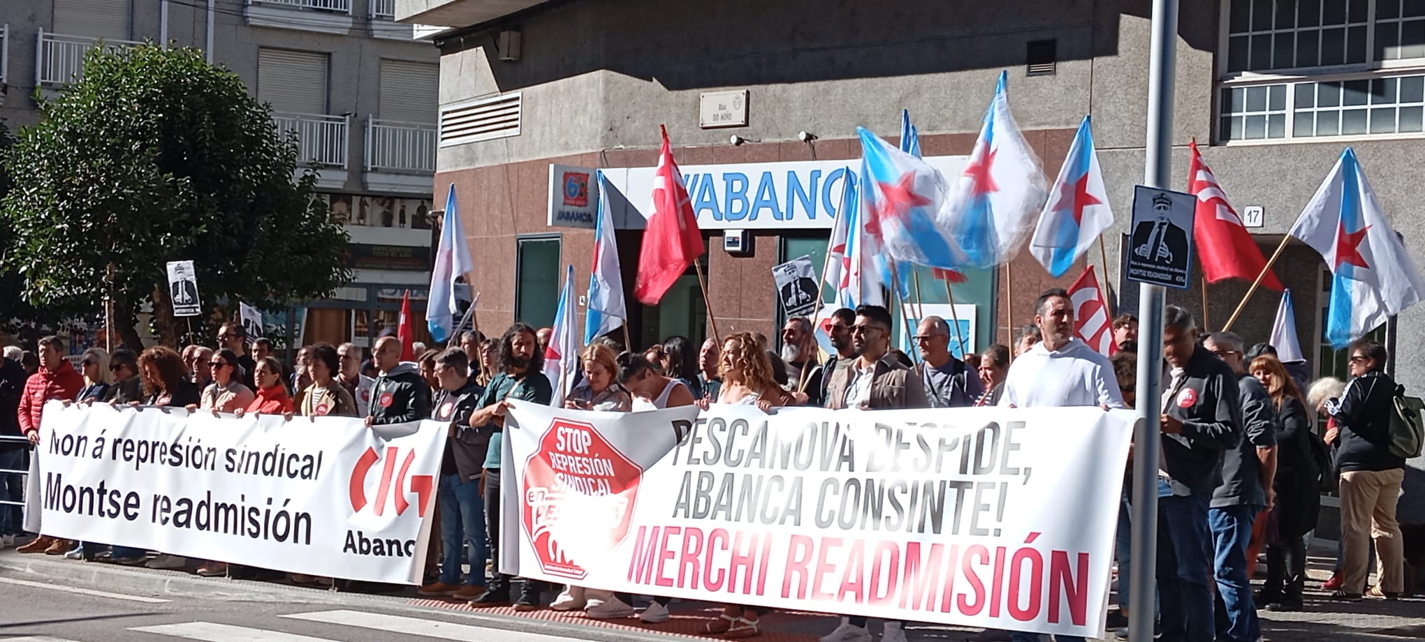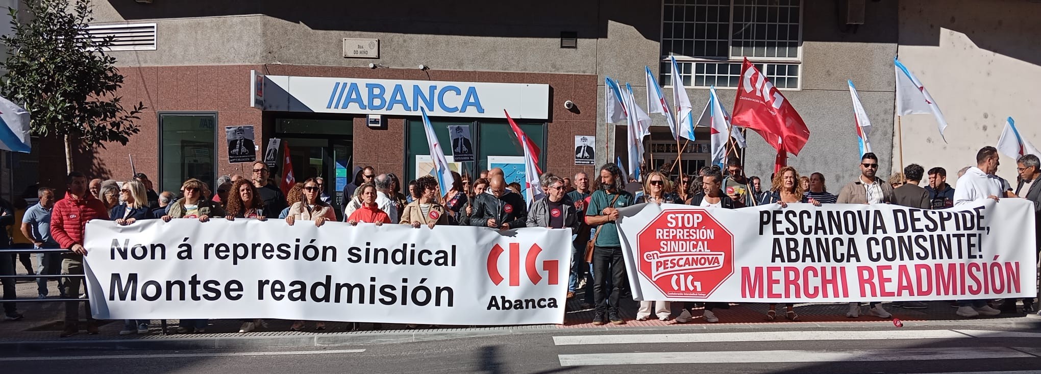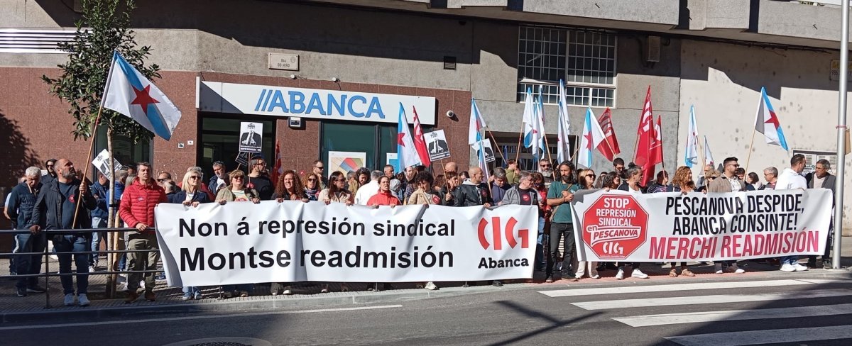 A CIG desenvolveu novas mobilizacións este martes contra a represión sindical en Abanca e Nueva Pescanova e para reclamar a readmisión das dúas delegadas despedidas. As protestas tiveron lugar diante da oficina da entidade bancaria en Salvaterra do Miño e ás portas das instalacións da empresa de alimentación no polígono porriñés das Gándaras.