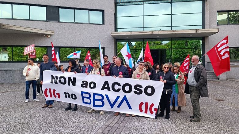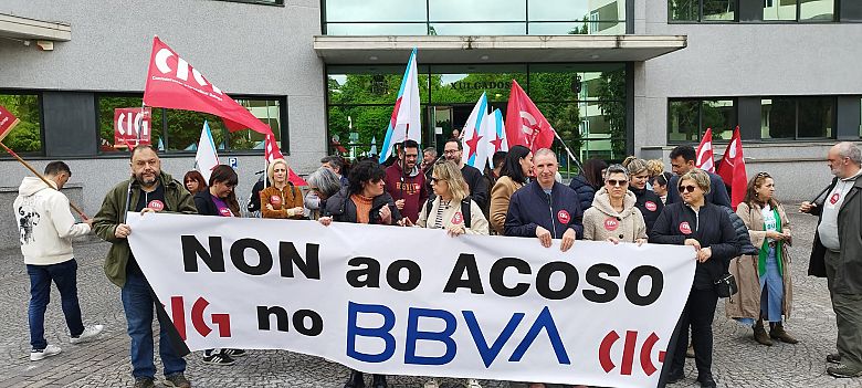 A sección sindical da CIG no BBVA concentrouse este xoves nos Xulgados de Lugo en apoio a unha compañeira, que ademais é delegada de persoal pola CIG, que sufriu acoso laboral por parte do seu superior directo. A protesta realizouse coincidindo coa celebración do xuízo pola demanda presentada contra o BBVA por vulneración de dereitos fundamentais, xa que a entidade bancaria dilatou de maneira inxustificada a apertura do protocolo de acoso, incorreu en varias irregularidades durante a súa aplicación e permitiu que se vulnerara a garantía de indemnidade da delegada.