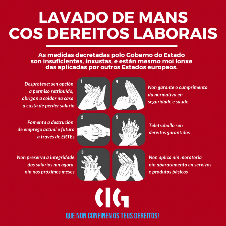Por outro lado, a CIG alerta de que “seguen sen se adoptar as medidas necesarias para que todo o mundo poida quedar na casa, nin se lle dispón dos medios para que as traballadoras e traballadores que teñan que ir traballar poidan facelo coas necesarias medidas de seguridade”. Xunto isto, salientou que as empresas que están ofrecendo o teletraballo non garanten nunhas condicións mínimas de respecto aos dereitos laborais e, en moitos casos, incluso baixo a obriga de poñer o traballador ou a traballadora gratuitamente todos os medios materiais para o desempeño do traballo no domicilio.