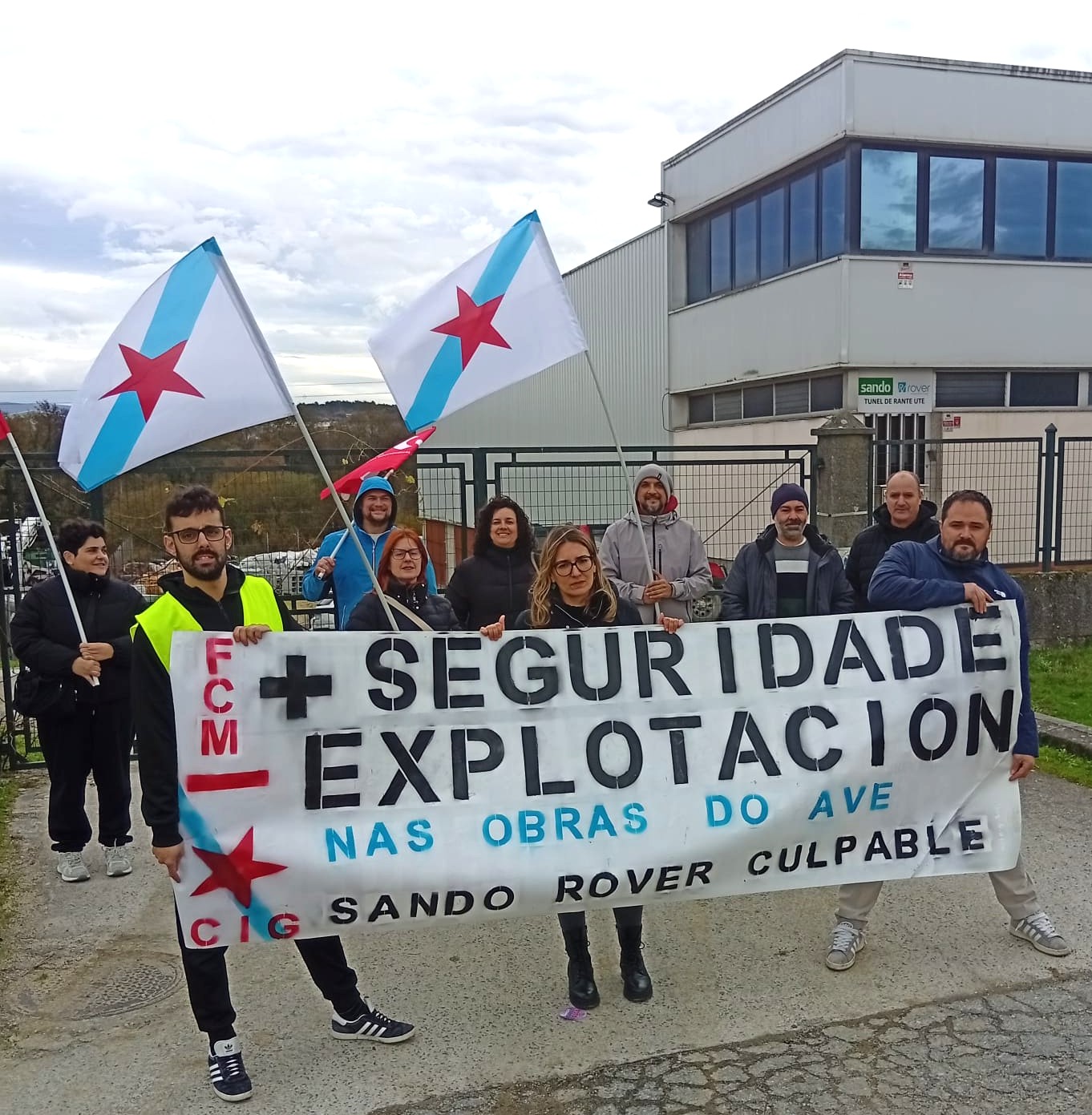 A Federación da Construción e Madeira (FCM) da CIG de Ourense levou a cabo hoxe unha concentración diante da sede da Unión Temporal de Empresas (UTE) que está a executar un dos tramos do AVE na provincia, Construcciones Sánchez Domínguez Sando y Rover Infraestruturas (Sando y Rover), para denunciar a situación de explotación e a falta de seguridade que padecen as persoas traballadoras destas obras, o que ten provocado xa varios accidentes graves e mesmo mortais.