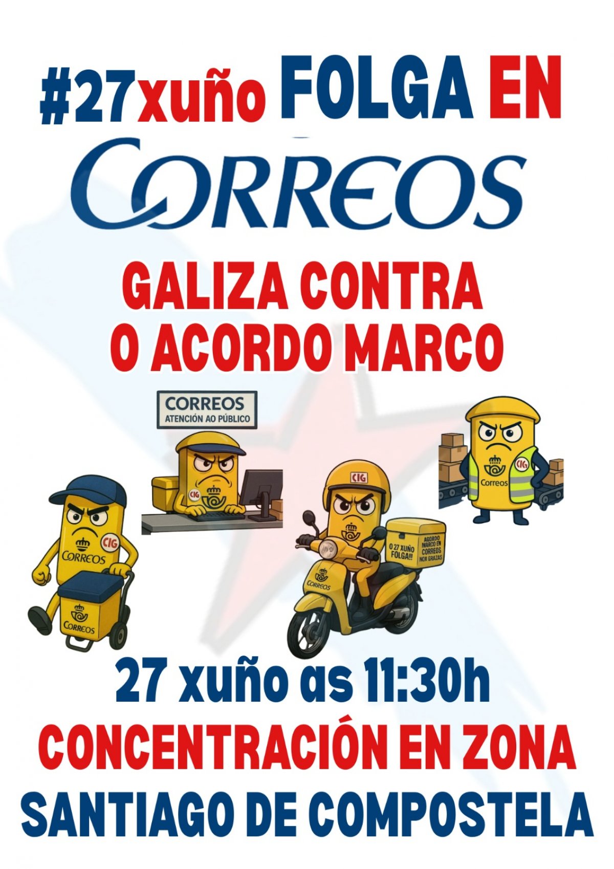 A CIG vén de anunciar a convocatoria dunha xornada de folga este venres 27 de xuño no servizo de Correos para rexeitar o Acordo Marco asinado pola empresa pública cos sindicatos CCOO, UGT e CSIF, que supón un recorte de dereitos laborais e non inclúe melloras salariais vinculadas ao IPC nin recupera o poder adquisitivo perdido en anos anteriores. Ademais, denuncian que terá un impacto negativo na saúde do persoal ao aumentar a presión, a sobrecarga e as condicións precarias. A central aproveitará o paro para desenvolver unha concentración diante da sede de Correos en Santiago ás 11:30 horas.