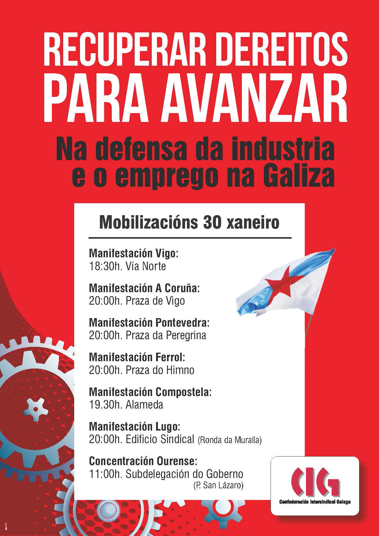 Ante a situación de emerxencia nacional e social que vivimos en Galiza, a CIG, como 1ª forza sindical, ten convocadas novas mobilizacións o xoves 30 de xaneiro, en todas as comarcas, para exixir a derrogación das reformas antiobreiras e cambios reais nas políticas que nos permitan recuperar os dereitos roubados e vivir e traballar dignamente na nosa Terra.