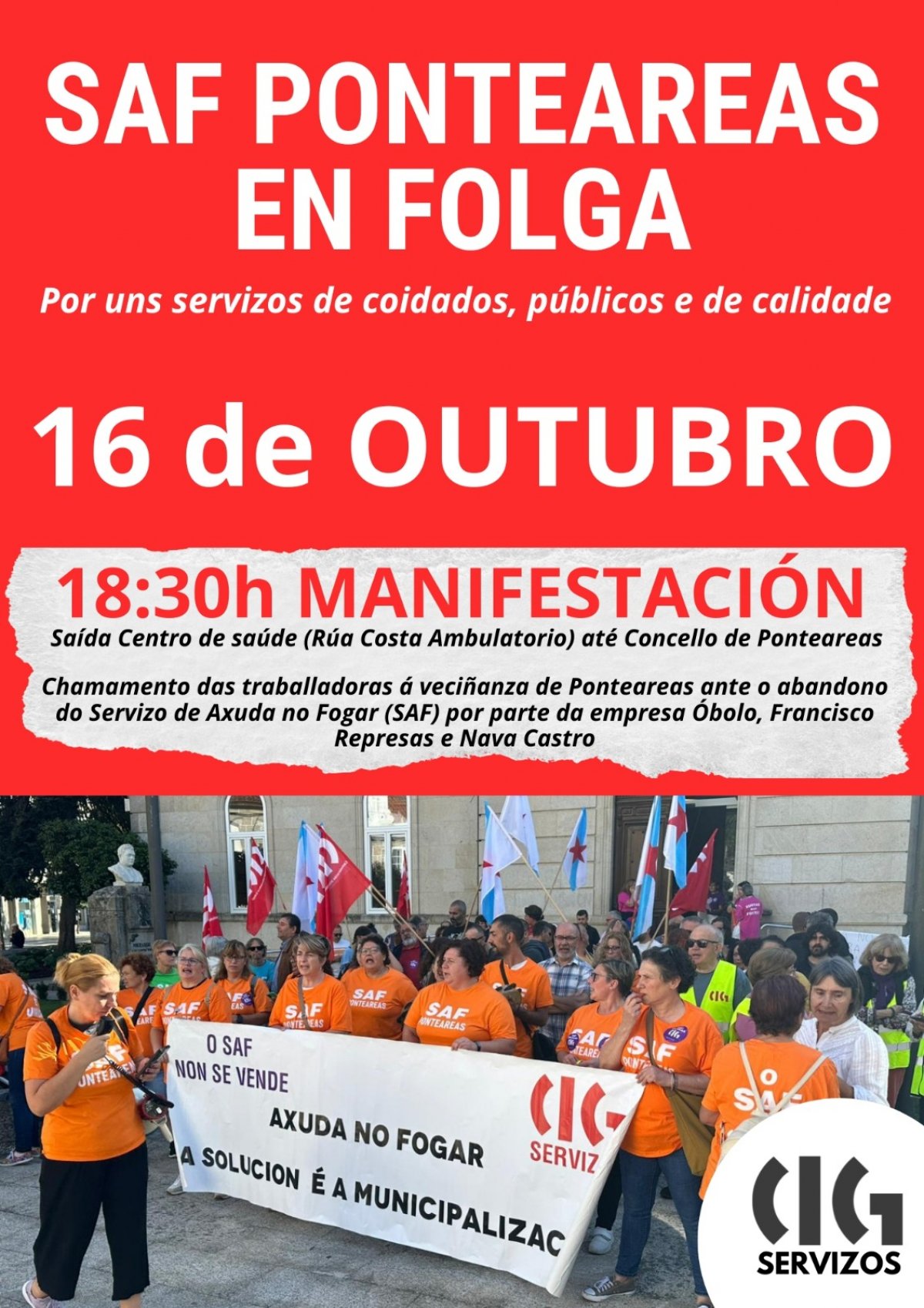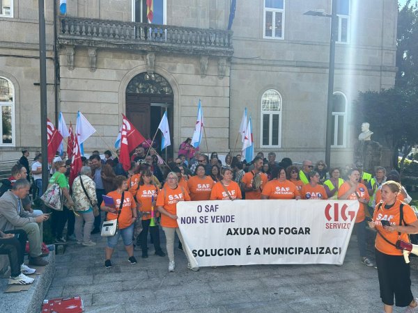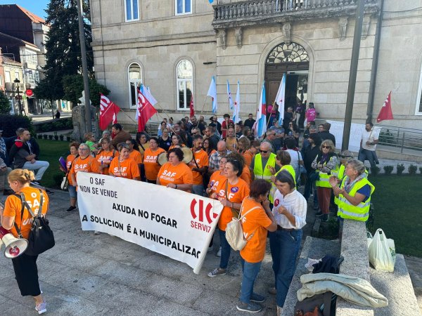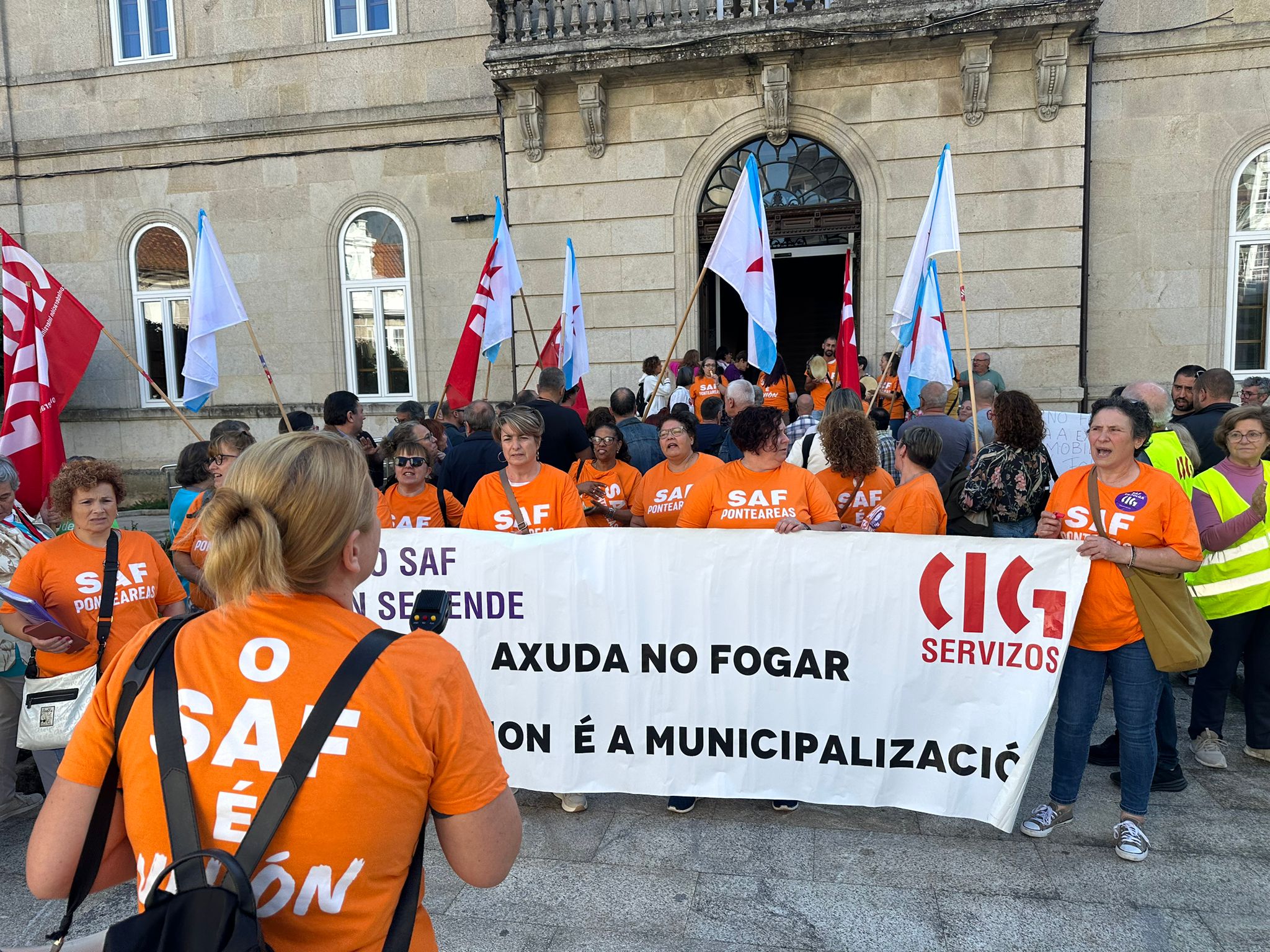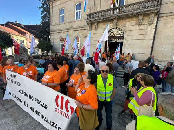 A CIG ten convocada unha manifestación este xoves 16 de outubro en apoio da loita do persoal do Servizo de Axuda no Fogar (SAF) do Concello de Ponteareas, en folga indefinida ante os graves incumprimentos da empresa, e para reclamar un sector de coidados público e de calidade. As traballadoras expuxeron a súas reivindicacións hoxe no pleno extraordinario no que saíu adiante unha moción do Goberno local que se limita a darlle un prazo á concesionaria para que corrixa as deficiencias pero que non contempla a rescisión do contrato como reclaman as afectadas.
