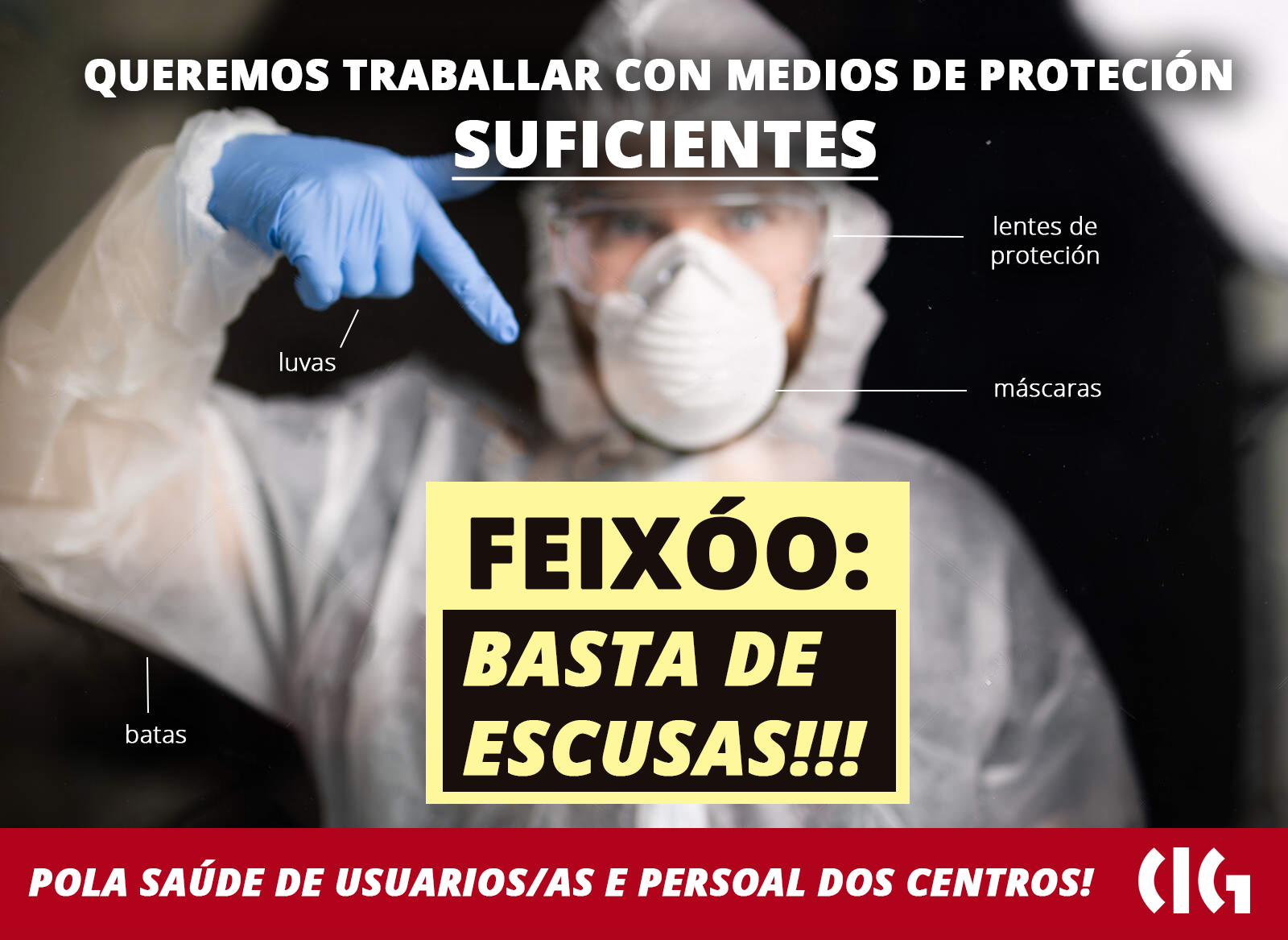 Con respecto ao material para casos confirmados ou sospeitosos estabelecidos polo protocolo de sanidade (en Política Social non hai un específico) que son luvas de nitrilo, máscaras FFP2 e FFP3, batas desbotables impermeables de manga longa, gafas de protección, así como o material para enfermos con problemas respiratórios, luvas de nitrilo e máscaras cirúrxicas, “as existencias nos distintos centros son escasas, non hai, ou son moi deficientes, ou non están a disposicion do persoal”.