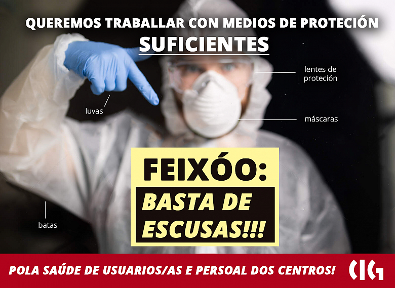 Ademais indica que aínda que a Consellería de Política Social fixo un documento que chama protocolo para os centros, “este refírese a normas de cara a residentes (limitación entradas visitas, etc), é demasiado xeneralista e non constitúe un Plan de Acción para o seu persoal na prevención dos riscos laborais nin trae medidas específicas para a súa protección fronte o virus”.