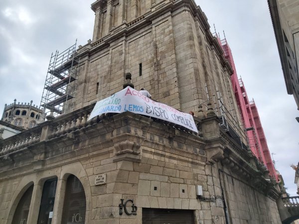 A CIG desprega unha faixa na catedral de Ourense para esixirlle ao bispo o cese do acoso no asilo do Carballiño