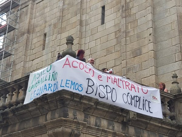 Varios membros da Unión Comarcal da CIG de Ourense despregaron esta mañá unha faixa nunha das varandas da catedral para esixir o cese do acoso laboral e do maltrato ás traballadoras do asilo do Carballiño, que xestiona a Fundación Hermanos Prieto, cuxo padroado preside o bispo ourensán. A central protagonizou hai 10 días unha ocupación simbólica da sede do Bispado para reclamar unha xuntanza co seu máximo responsábel, tras a que anunciara que se en 48 horas non obtiña resposta procedería a intensificar as mobilizacións.