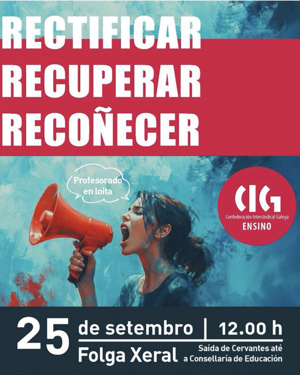 A CIG-Ensino ten convocada folga xeral no ensino público non universitario para este xoves 25 de setembro contra a política de recortes e de propaganda da Xunta de Galiza. Con esta folga reivindícase a recuperación de dereitos (nomeadamente o horario lectivo recortado desde os anos 2011 e 2012, nos que se subiron a 25 horas en infantil e primaria e a 18 no resto de ensinanzas) e avanzar noutros relativos á redución de ratios en todas as etapas, incrementar o persoal para atender a diversidade, a eliminación da burocracia inútil e o recoñecemento salarial e profesional que merece o traballo docente. Ademais, a CIG-Ensino tamén esixe poder traballar en liberdade, sen censuras nin imposicións por parte da Consellaría de Educación.
