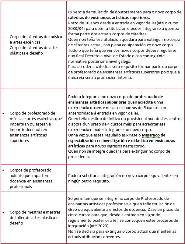 Se ben é certo que na tramitación parlamentaria melloraron algunhas cuestións, mantivéronse algunhas decisións que a CIG-Ensino considera negativas (a oposición a manter un proceso de integración con carácter indefinido no corpo de mestres de taller), preocupantes (as novas atribucións para as direccións propoñeren a contratación de profesorado especialista ou visitante e designar directamente profesorado emérito), e de futuro incerto (a esixencia da titulación de doutoramento para o corpo de cátedras de ensinanzas artísticas superiores polo reducido número de docentes que poderán cumprir un requisito que non ten precedentes nos corpos docentes).