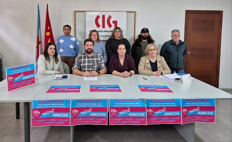 Delegadas da CIG no comité de AMICOS e traballadoras despedidas e represaliadas compareceron esta mañá en rolda de prensa, xunto ao secretario comarcal da CIG-Ensino, Rubén Monteagudo para denunciar a situación de terror laboral que se vive na empresa. A CIG denuncia tamén máis de 20 despedimentos e 18 baixas voluntarias no último ano e medio e anuncia a convocatoria dunha mobilización para o vindeiro día 26 de marzo, ás 19:30 horas en demanda do cumprimento do convenio e para que remate a campaña de acoso.