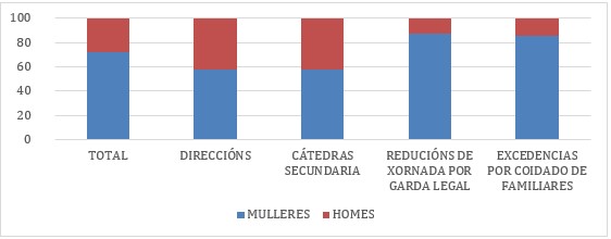 Dos datos finalmente aportados, concluímos que efectivamente existe fenda de xénero no ensino público non universitario, xa que a porcentaxe media de mulleres, un 72% no profesorado total, cae ao 58% cando falamos de mulleres que ocupan as direccións. Coincide esta porcentaxe coa de mulleres catedráticas de ensino secundario, corpo ao que se accede por concurso de méritos. Estas dúas cuestións supoñen un incremento retributivo e pola contra, en asunción de medidas de conciliación, como excedencias por coidado ou reducións de xornada, pasan do 72% ao 85%.