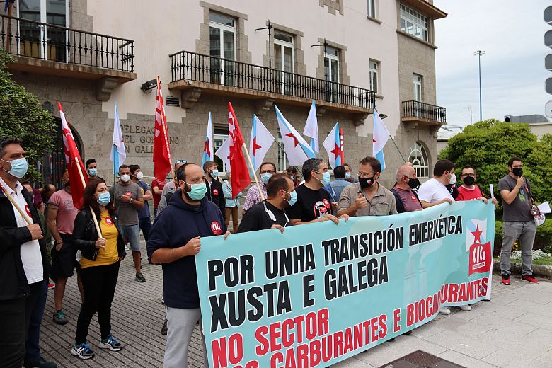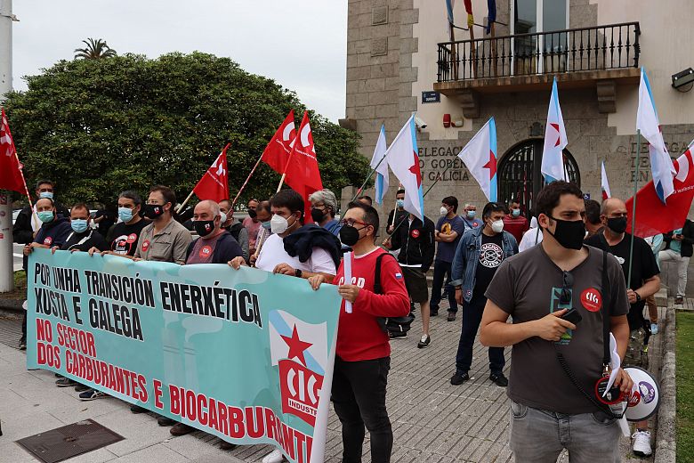 A CIG realizou unha concentración este venres diante da Delegación do Goberno na Coruña para esixir unha transición enerxética galega xusta no sector dos carburantes e biocarburantes e que garanta, no marco do proceso de descarbonización da economía, a posta en marcha de alternativas de reindustrialización e creación de postos de traballo nos territorios afectados.