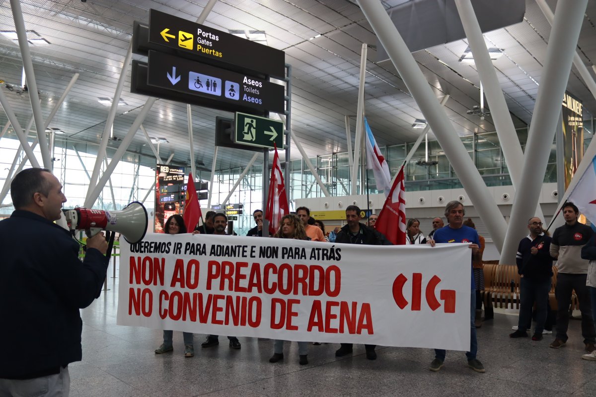 Persoal de AENA e ENAIRE do aeroporto de Santiago concentrouse esta mañá na terminal de saídas para manifestar o seu rexeitamento ao preacordo de convenio colectivo asinado por CCOO e UGT, para AENA ENAIRE, de costas aos traballadores e traballadoras. Un preacordo que estes sindicatos deberán agora que explicar en asemblea logo de que a CIG conseguira xuntar máis das sinaturas necesarias para forzar ao comité a convocala.