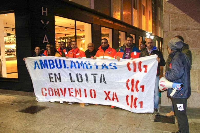 Persoal das ambulancias, acompañado por membros da FGAMT-CIG, agardaron a chegada do conselleiro ao establecemento hoteleiro cangués onde ía ter lugar o acto organizado polo PP coa intención de facerlle chegar as reclamacións dun colectivo que semanas atrás se manifestou polas rúas de Vigo para denunciar precisamente a falta de implicación da Xunta no conflito laboral aberto para demandar a negociación dun convenio digno fronte ás propostas regresivas da patronal. Dende a central lembran que o causante da situación foi o propio Goberno autonómico ao outorgar concesións á baixa.