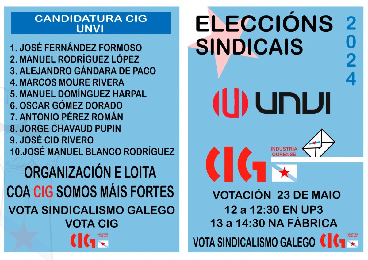 A federación de Industria da CIG de Ourense convértese na forza maioritaria no comité de empresa de UNVI, compañía do grupo Pérez Rumbao dedicada á fabricación de autobuses, tras sumar 4 dos 9 representantes do comité que se escollían nas eleccións sindicais celebradas hoxe.