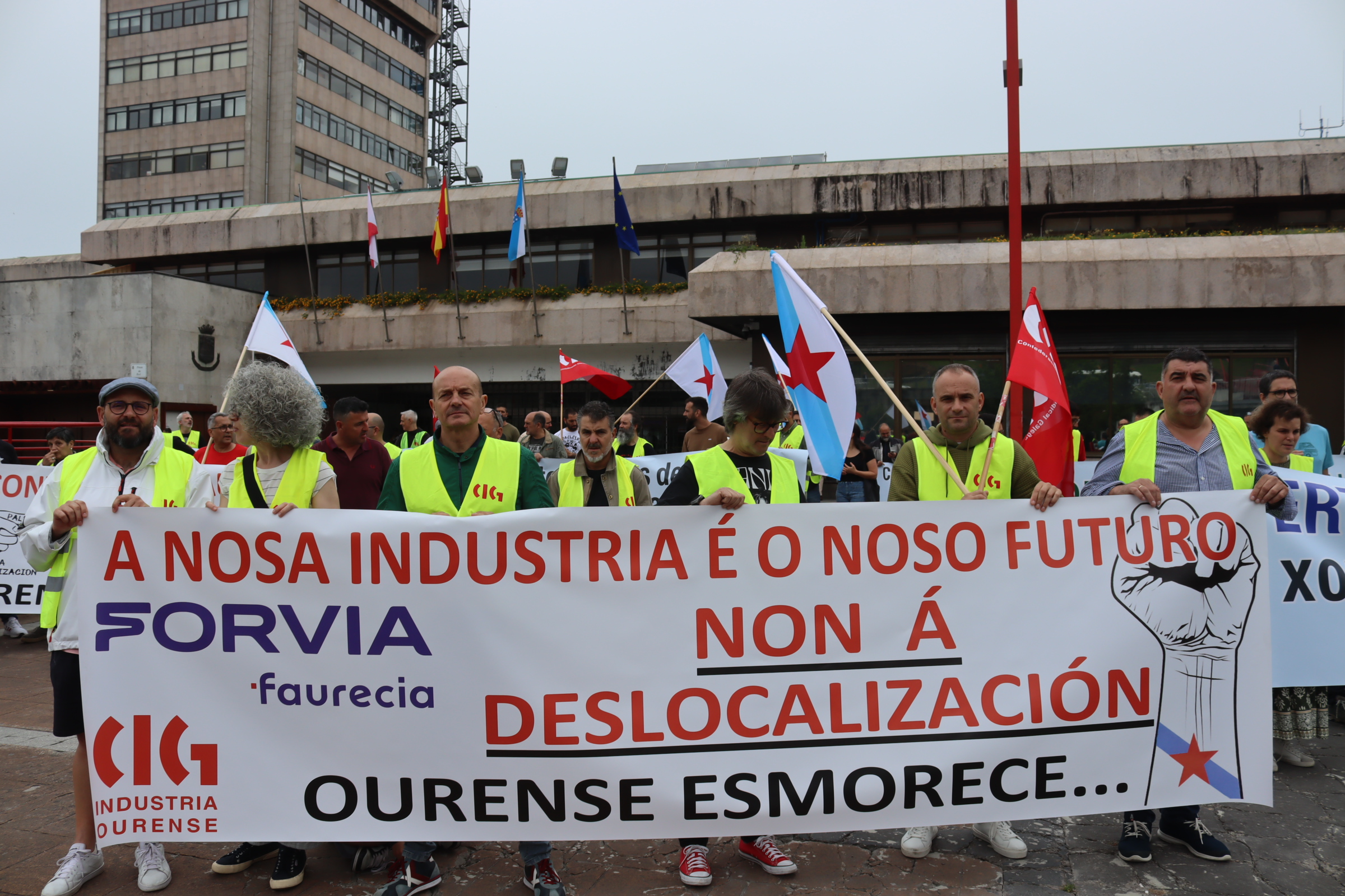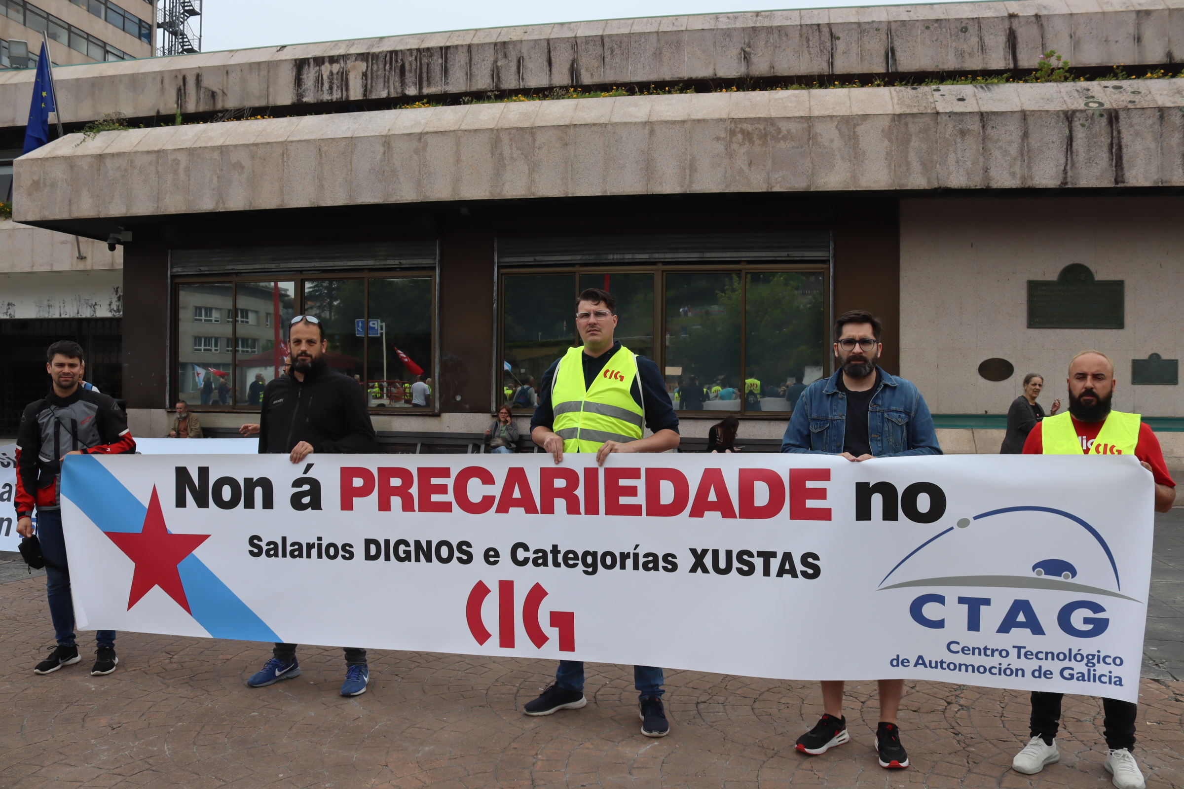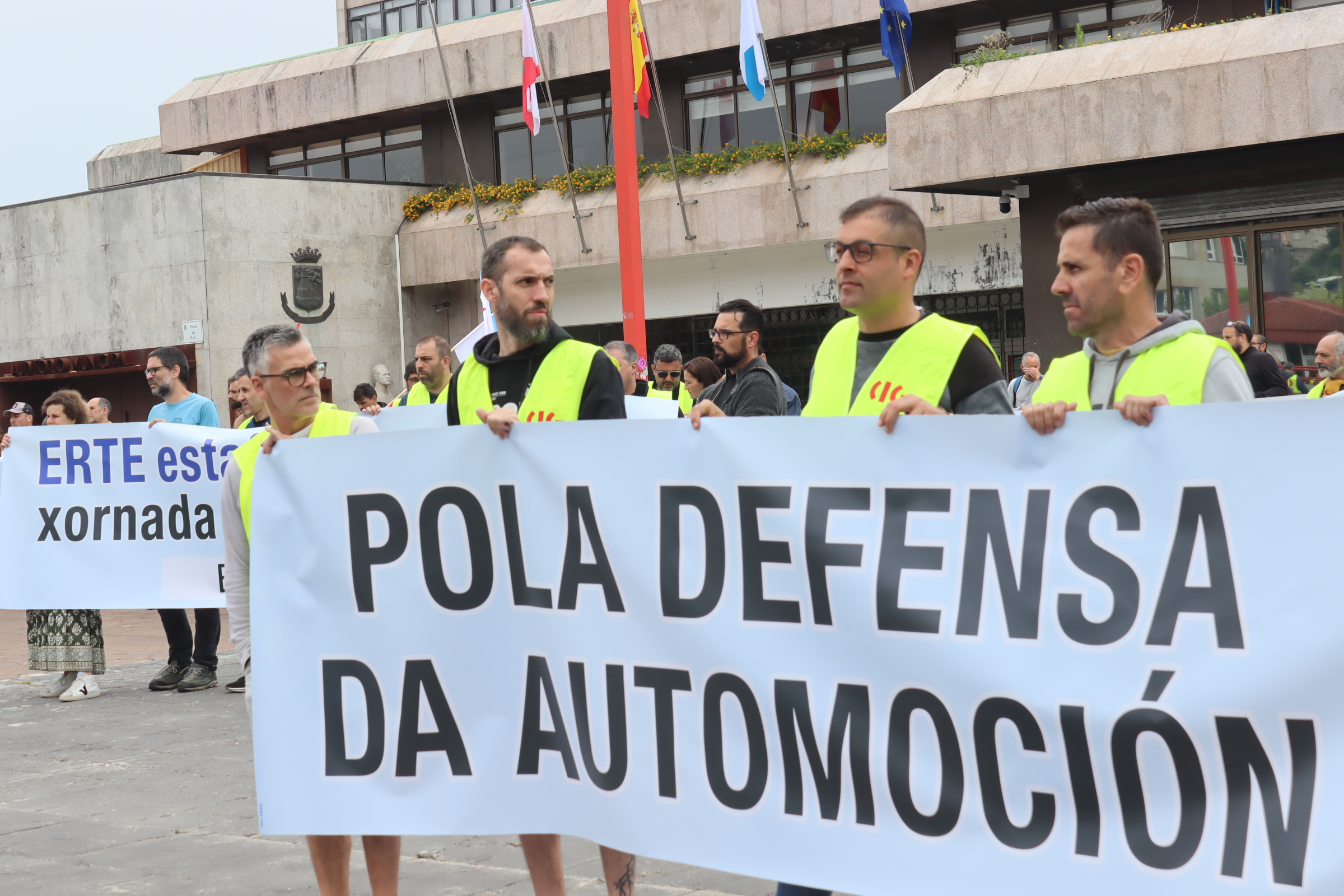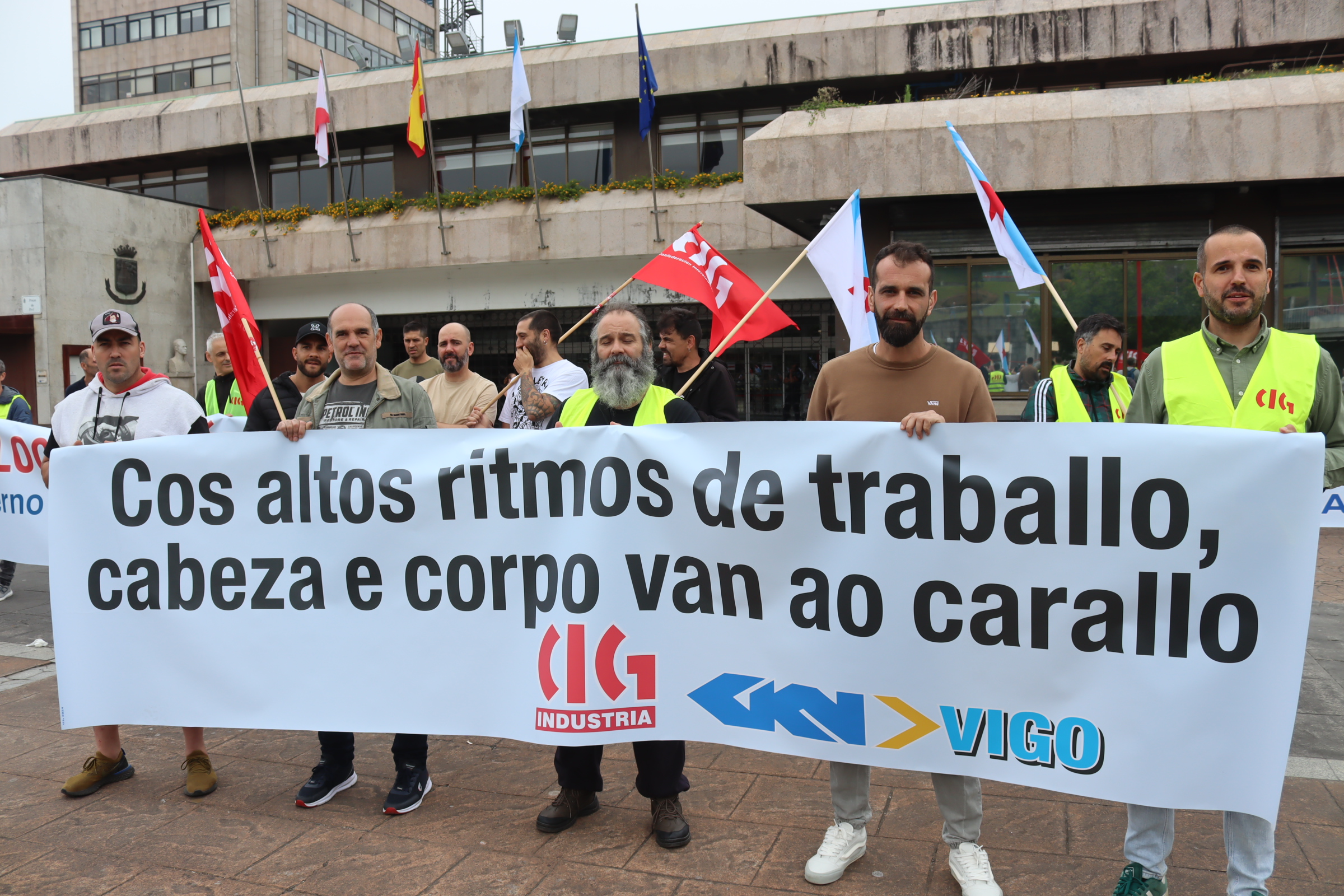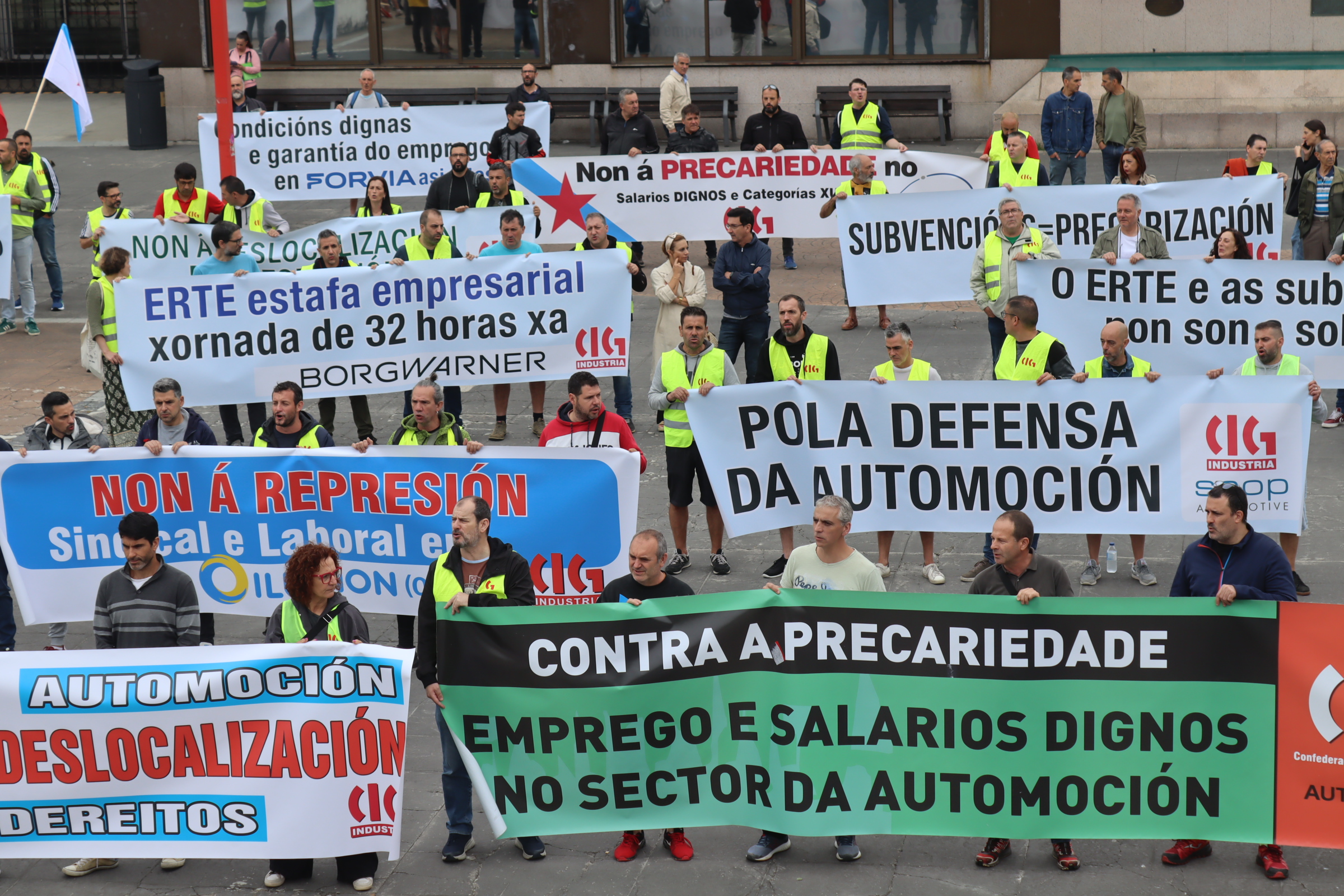 Deslocalización, explotación, precarización, reconversión. Estas son as principais ameazas que enfronta o sector galego do automóbil, e que a CIG escenificou hoxe diante do Concello de Vigo cunha concentración na que representantes da central sindical en máis de 20 empresas da industria da automoción despregaron faixas e expresaron ás súas problemáticas concretas.