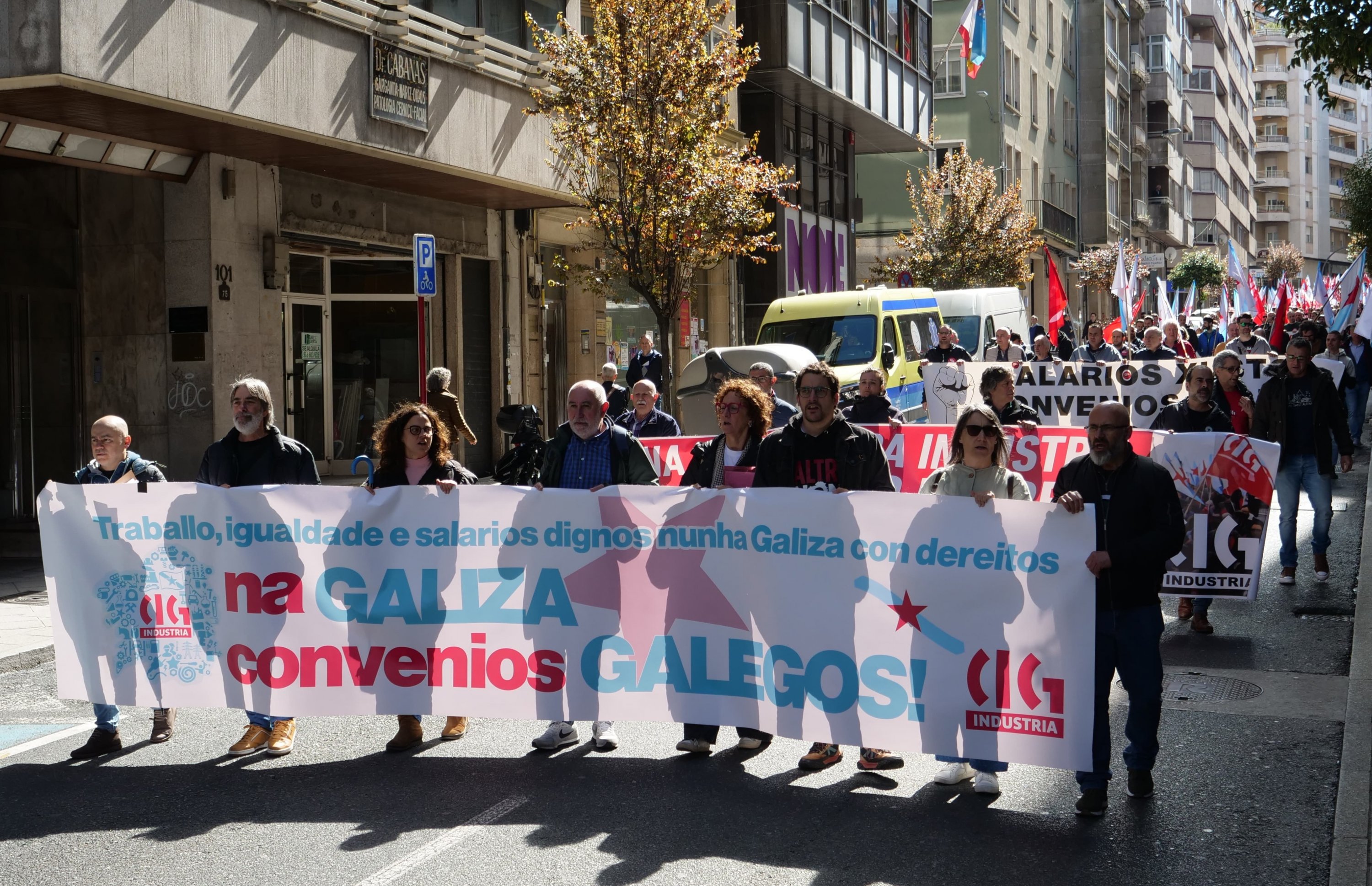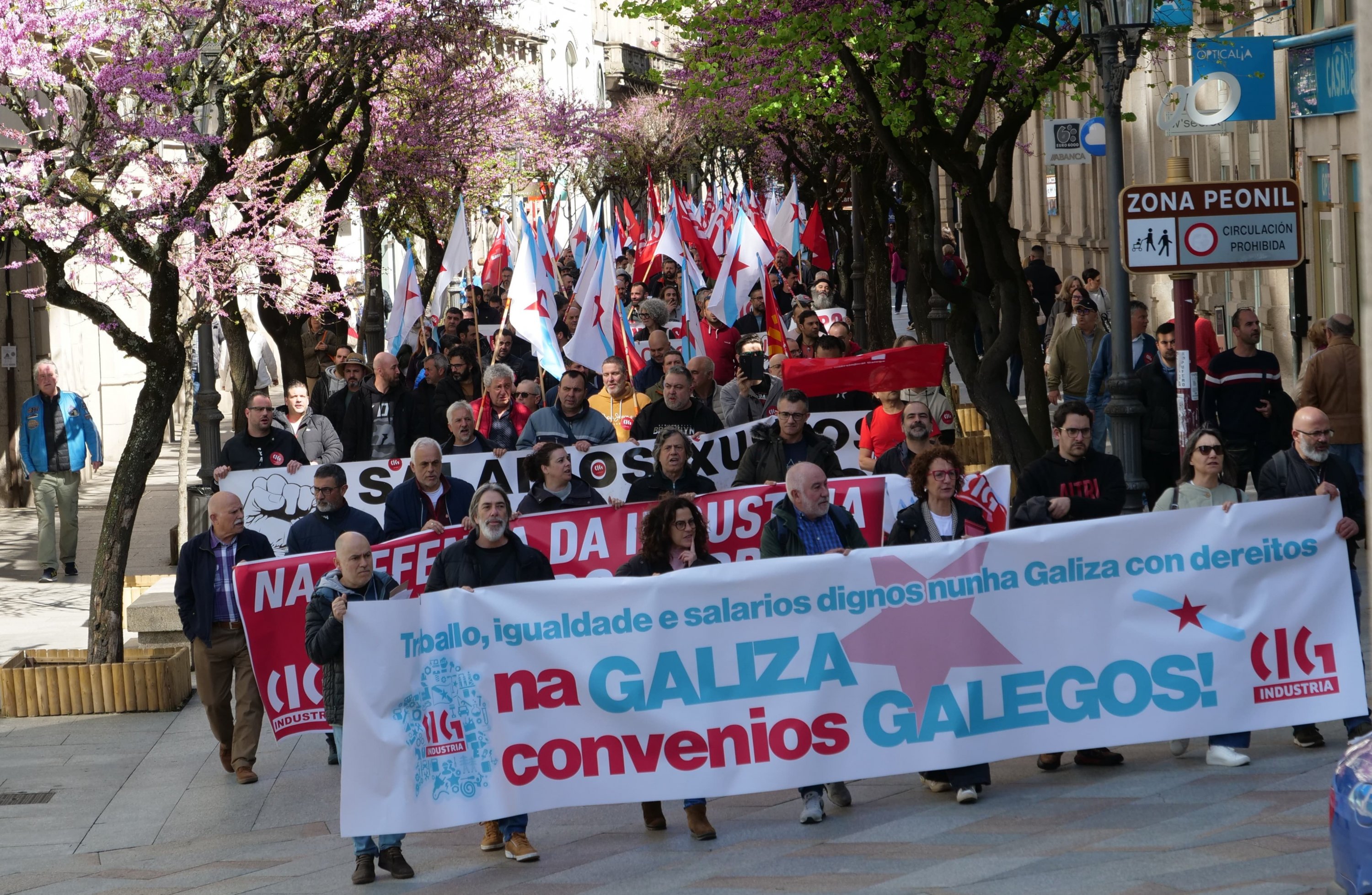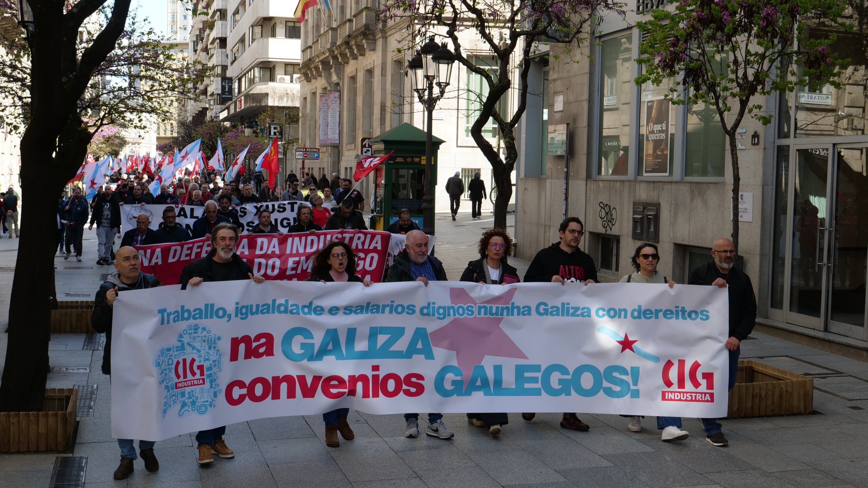 A CIG-Industria celebrou hoxe en Ourense unha asemblea nacional de delegados/as na que se abordou a situación e as principais problemáticas de sectores como automoción, naval, eólico ou siderometal e de empresas como Alcoa, Navantia, Vestas ou Faurecia. Ao remate do encontro que tivo lugar no auditorio municipal no marco da campaña que a central está a desenvolver a nivel nacional baixo o lema “Traballo, igualdade e salarios dignos nunha Galiza con dereitos’ desenvolveuse unha manifestación até a sede da Confederación de Empresarial (CEO) para reclamar un convenio galego para o sector do metal.