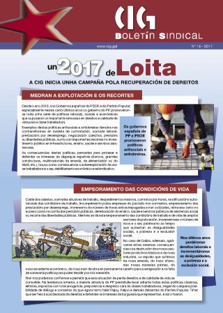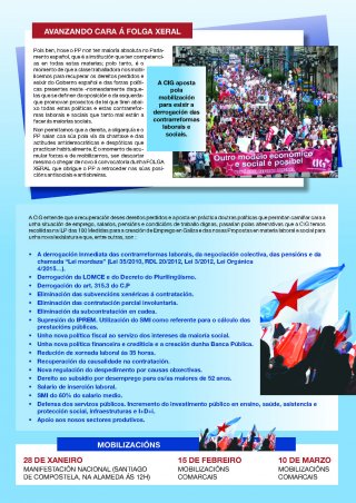 Ademais, no marco desta campaña tamén están previstas concentracións comarcais o 15 de febreiro e mobilizacións o 10 de marzo, sen descartar a convocatoria dunha folga xeral cara aos meses de abril ou maio no caso de que tras a posta en marcha desta iniciativa de concienciación e de acumulación de forzas non se aproban no Congreso español medidas que permitan a recuperación de dereitos perdidos.
