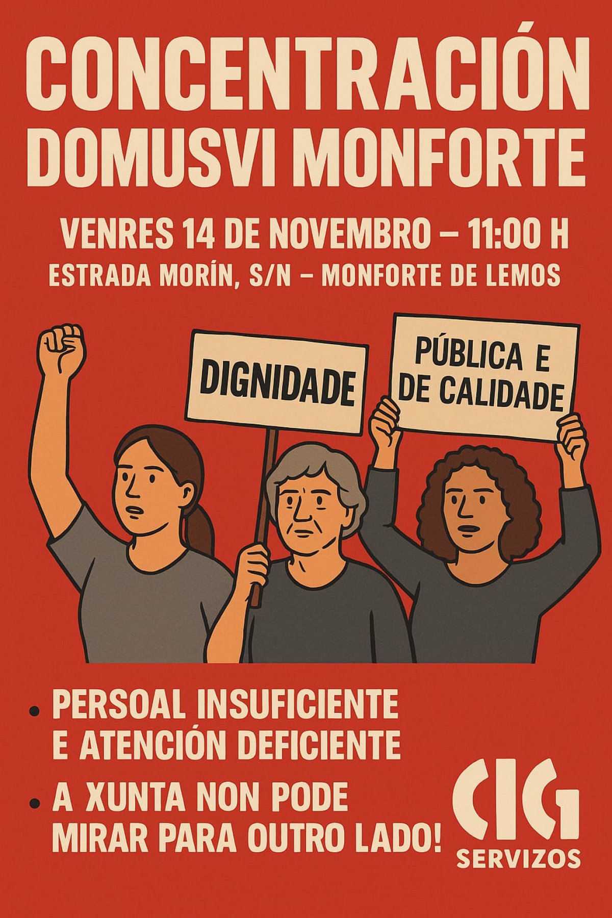 E neste senso, a Unión Local da CIG convoca a unha concentración para o próximo venres 14 de novembro, ás 11:00 horas diante da residencia de maiores DomusVI de Monforte de Lemos, nas que anima a participar tanto ao persoal da residencias e ás familias usuarias, como ao conxunto da veciñanza xa que se trata de exixir servizos asistenciais de calidade.
