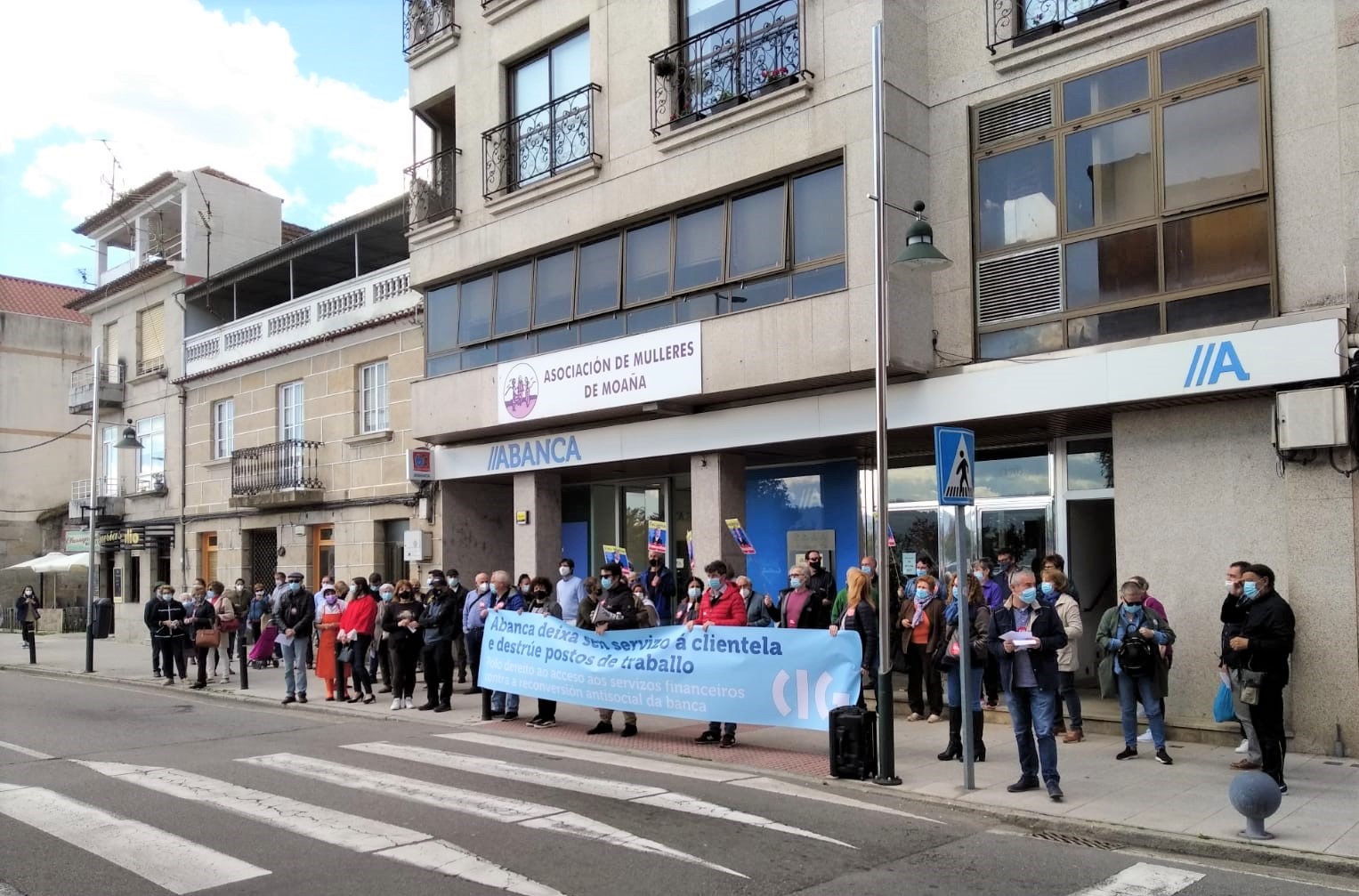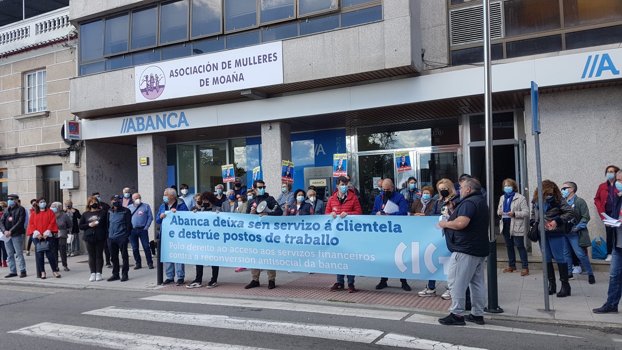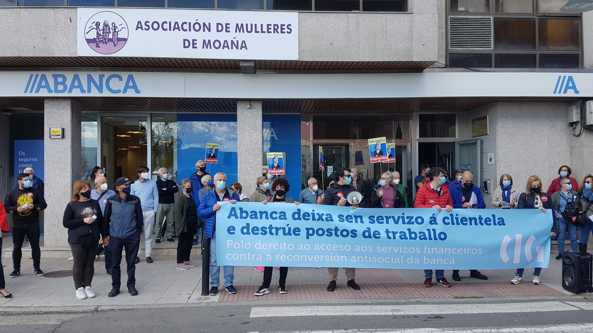A CIG desenvolveu hoxe unha mobilización diante da oficina de Abanca na rúa Concepción Arenal de Moaña para rexeitar o peche da sucursal da rúa Ramón Cabanillas e denunciar a restrición de servizos na atención presencial ao público. Na concentración participaron tamén numerosos/as veciños/as e unha representación do Goberno local moañés, coa alcaldesa á cabeza.