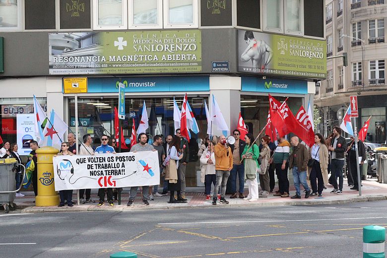 A CIG desenvolveu dúas concentracións este martes na Coruña para denunciar a política de deslocalizacións no sector dos centros de chamadas e reivindicar o mantemento dos postos de traballo na Galiza. A primeira protesta realizouse diante das oficinas de Atento en rexeitamento á decisión da empresa de pechar o servizo de atención de avarías na quenda de noite e trasladalo a Colombia.