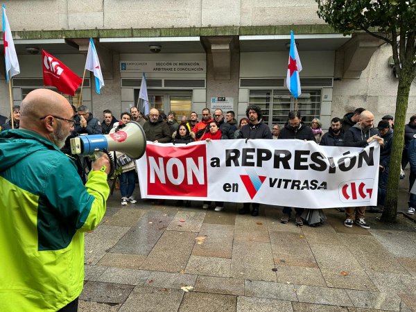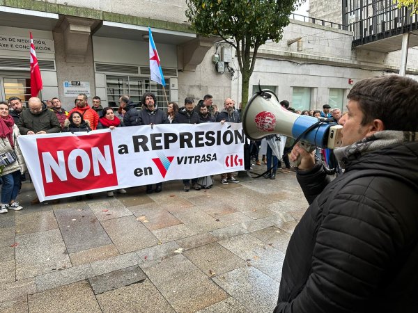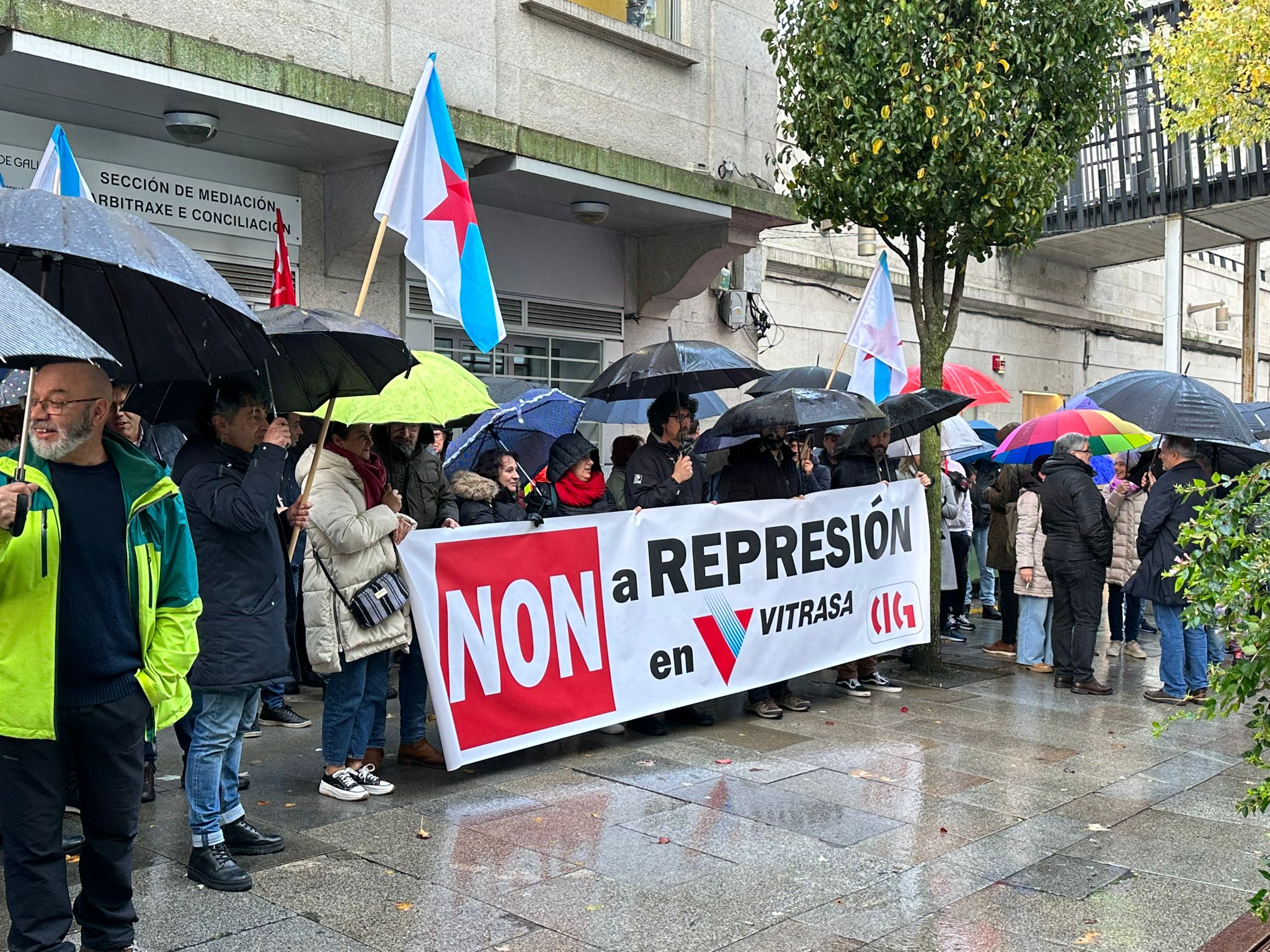 Delegados/as sindicais da CIG mobilizáronse hoxe diante do SMAC en Vigo en solidariedade cos seis afiliados da central sancionados pola dirección de Vitrasa pola súa participación na folga convocada na concesionaria do servizo de transporte urbano para reclamar un convenio colectivo digno. A protesta coincidiu coa celebración do acto de conciliación previo ao xuízo, que rematou sen acordo pola negativa da empresa a retirar as sancións, polo que deberá ser o xulgado quen decida.